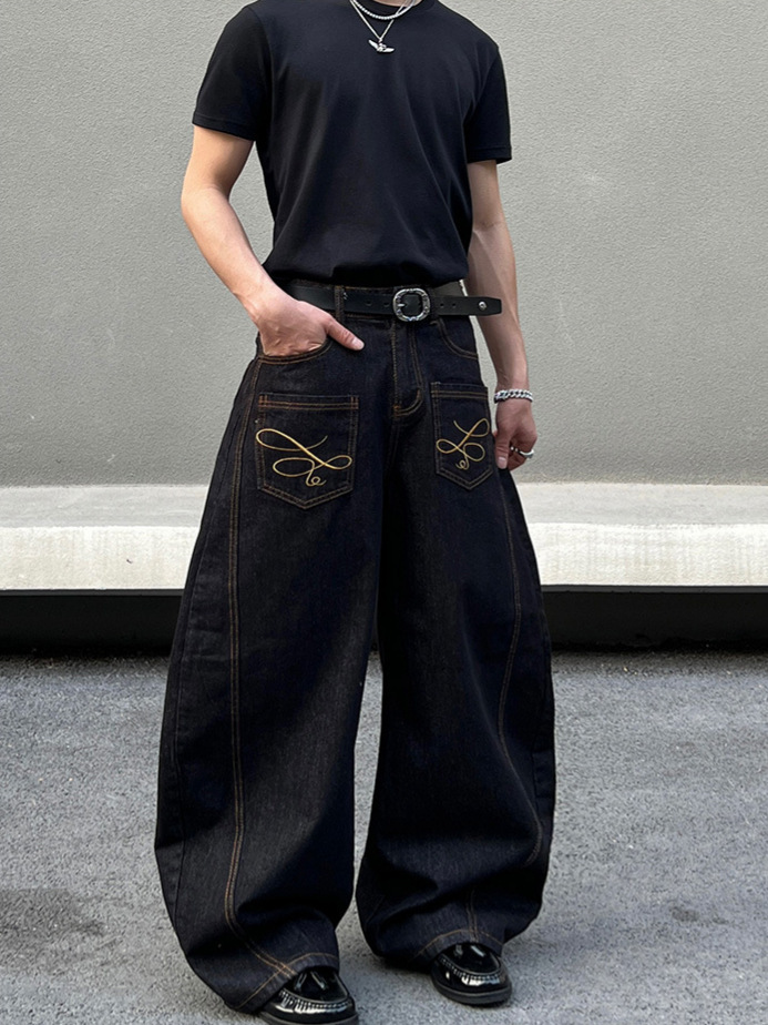 アメリカンレトロニッチ刺繍デザインデニムオリジナルカウバギーシミタージーンズメンズワイドレッグルーズシミターパンツ