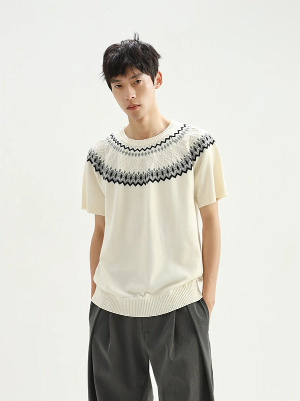 フェアアイルジャカードニット半袖メンズ夏通気性クール七分袖アメリカンレトロウエストショルダーTシャツ