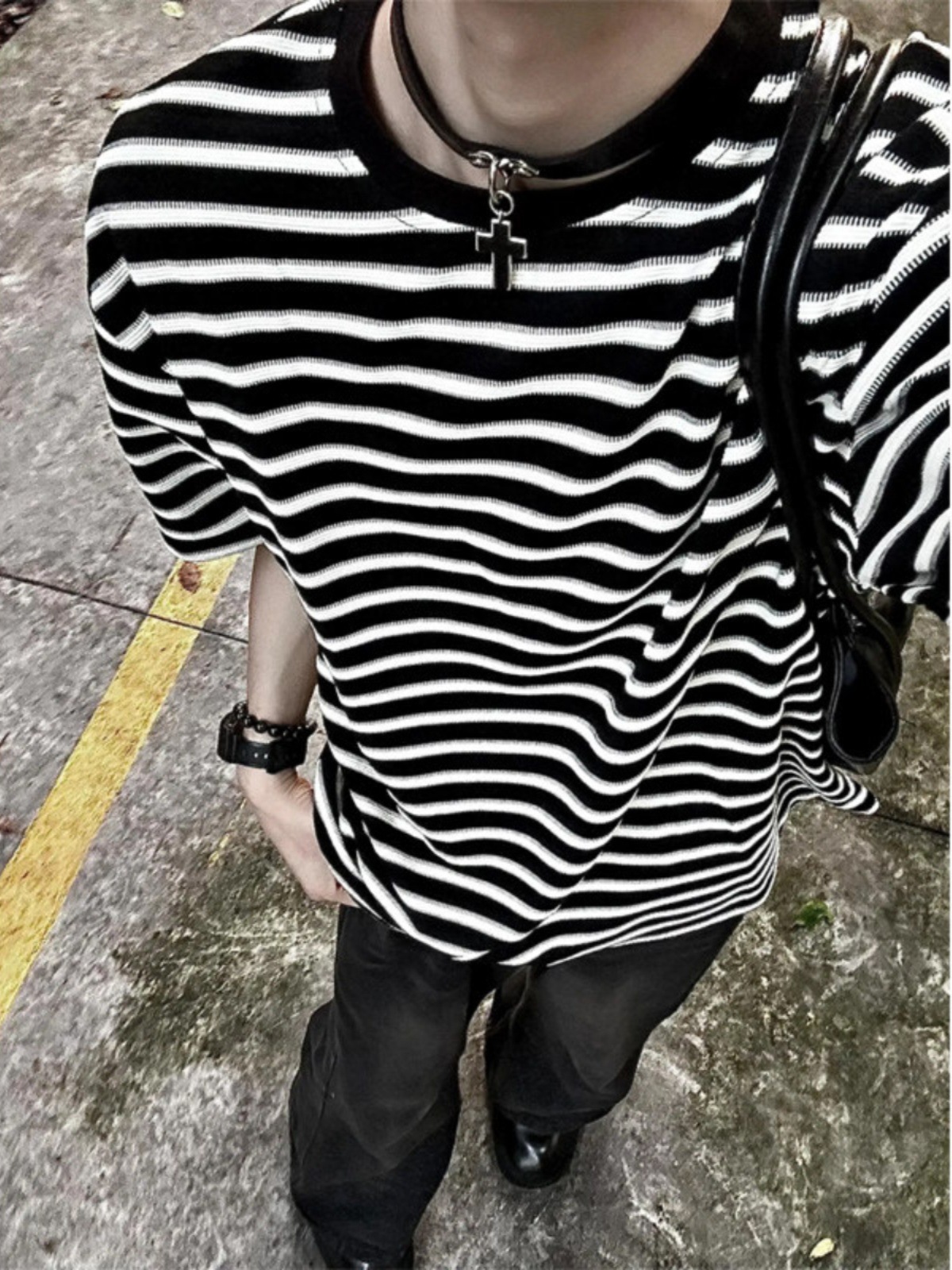 Cleanfit 黒と白のストライプ半袖メンズ夏 300 グラムヘビーウェイトスモールネック Tシャツヘビーウェイトアメリカンルーズ半袖