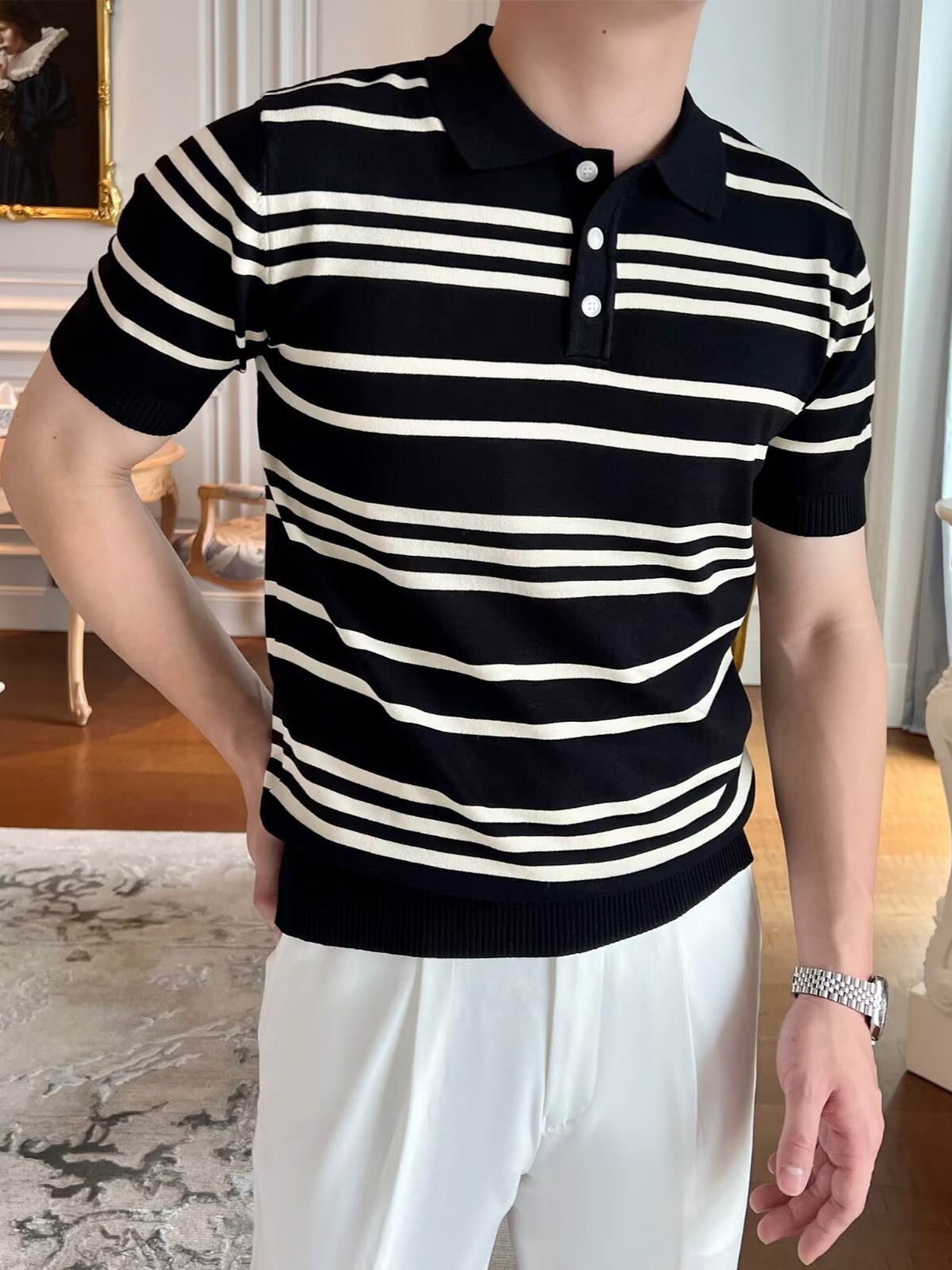 通気性のあるストライプのコントラストカラーの半袖セーターメンズ薄手カジュアルラペル半袖セーター夏の新しいトップス男性用