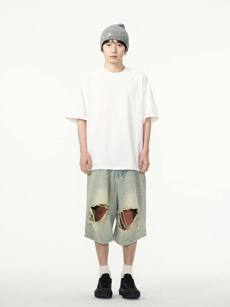カップル向けのハイストリートパンツ、ルーズカジュアルストレートレッグ5分パンツ、アメリカンレトロニッチダメージ加工デニムショートパンツ、メンズ