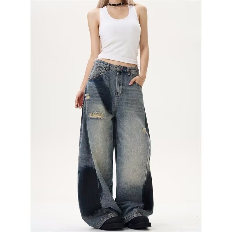 アメリカンレトロウォッシュ加工ダメージジーンズレディース新作トレンドブランドルーズストレートハイストリートワイドレッグパンツカップル用