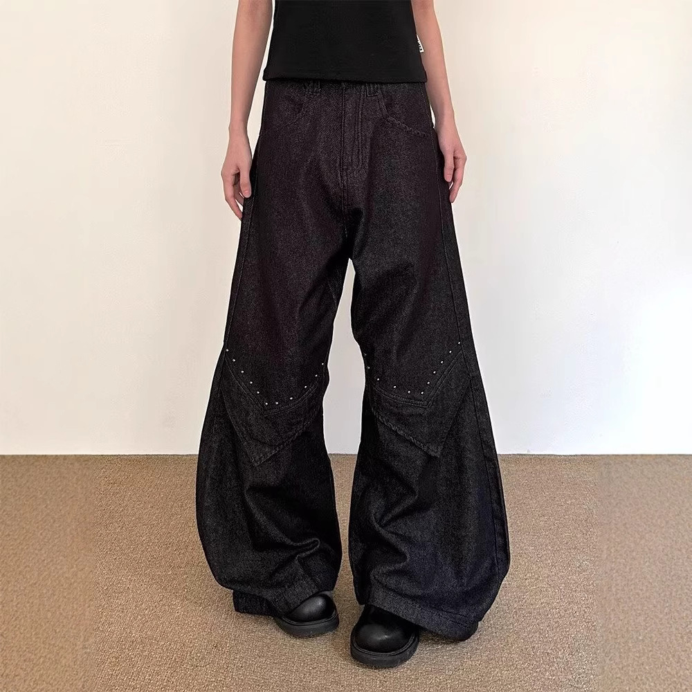 2025年新作アメリカンハイストリートシミタージーンズ、男性と女性向け、ハイエンドトレンディなリベットバイブニッチワイドレッグパンツ