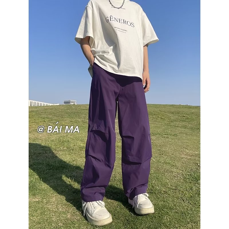 パープルアイスシルク速乾パラシュートパンツメンズ夏薄いアメリカンハイストリートワイドレッグカジュアルパラトルーパーワークパンツ