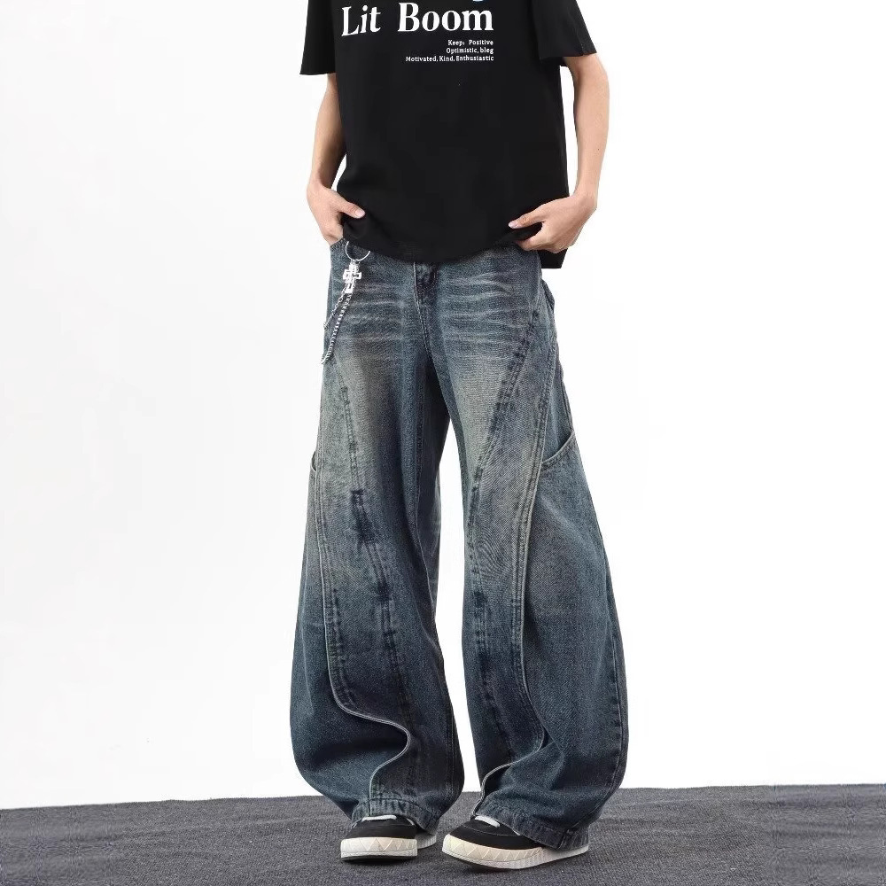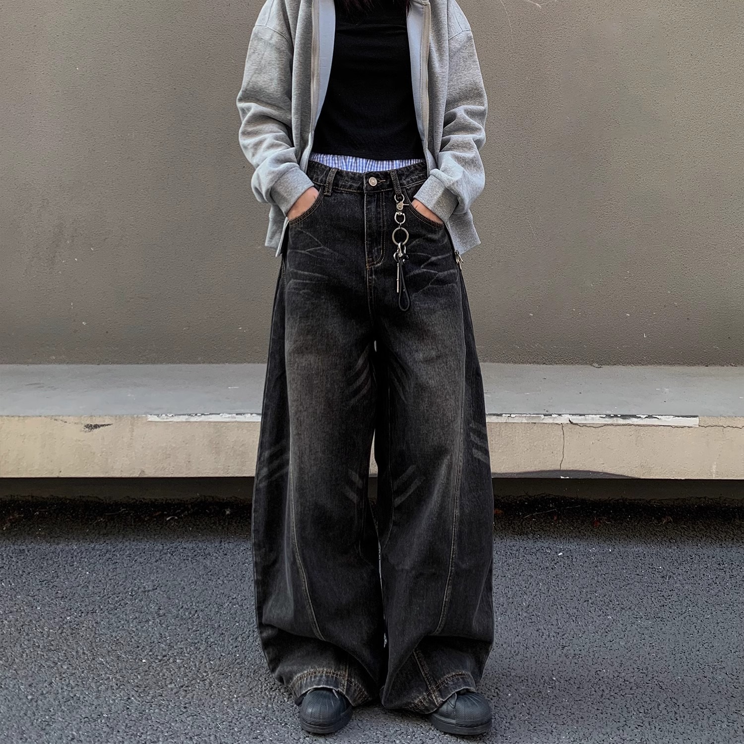 アメリカンレトロウォッシュ加工ブラックシミタージーンズワイドレッグルーズトレンディブランドハンサムハイエンドパンツ外国貿易