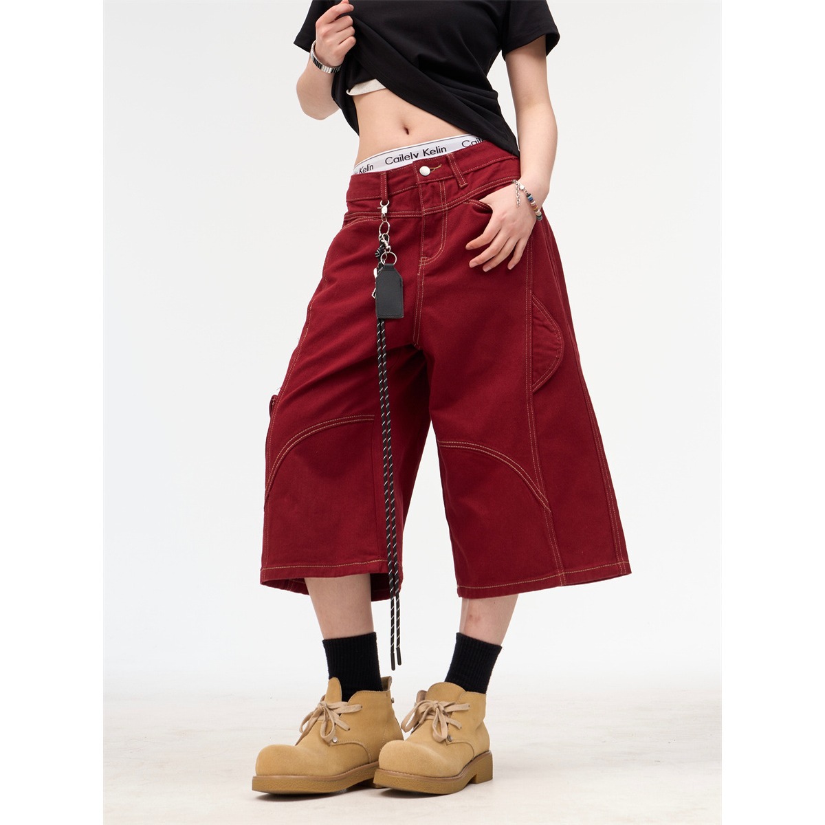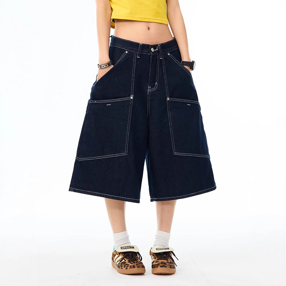 アメリカンレトロトップステッチデコンストラクトデニムクロップドパンツ女性用2025春夏ストリートラージポケットデザインオーバーオールショートパンツ