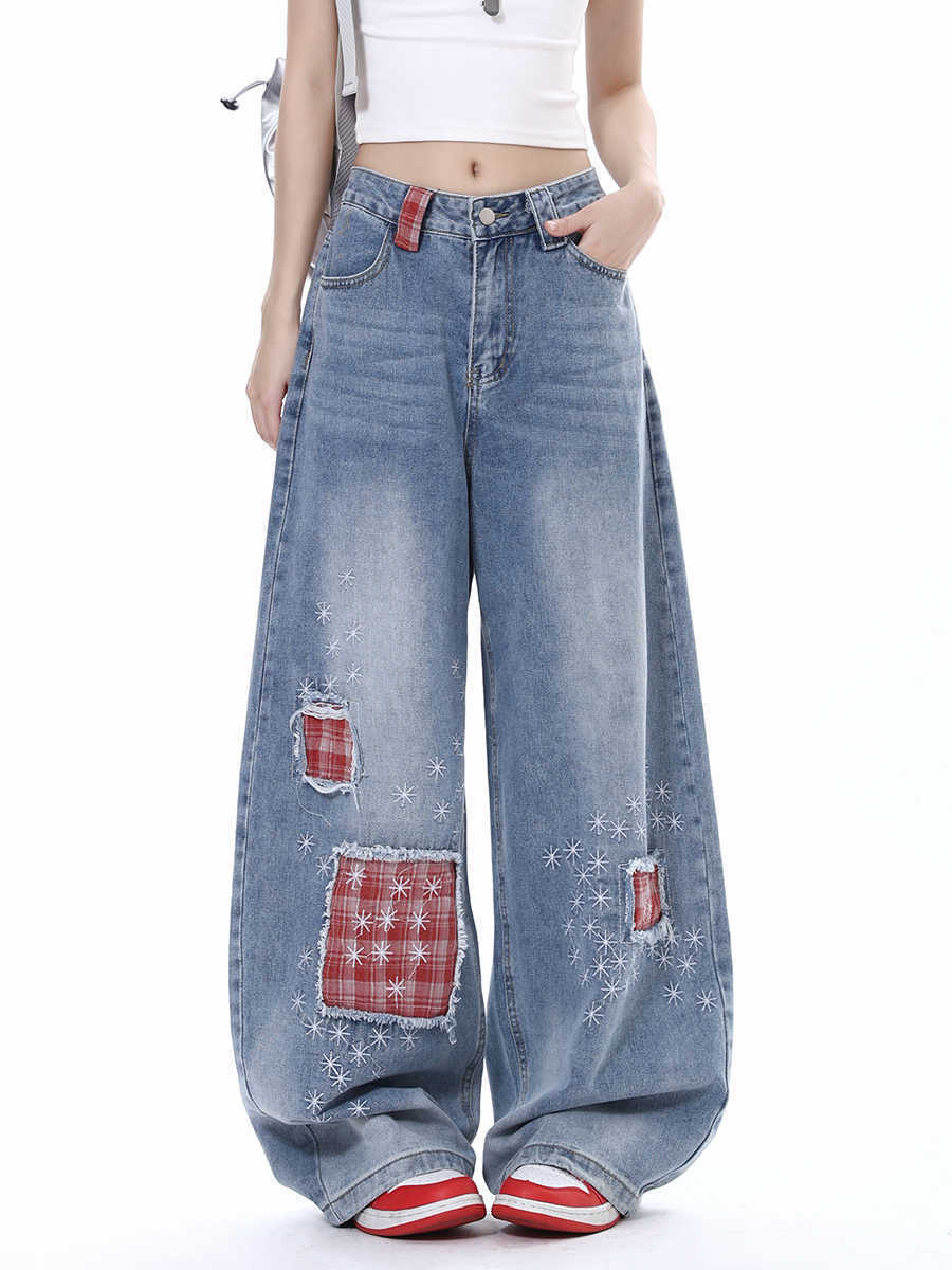アメリカンレトロチェック柄パッチワークワイドレッグジーンズメンズトレンディブランドルーズカジュアルスリムデザインストレートレッグフロアレングスパンツ
