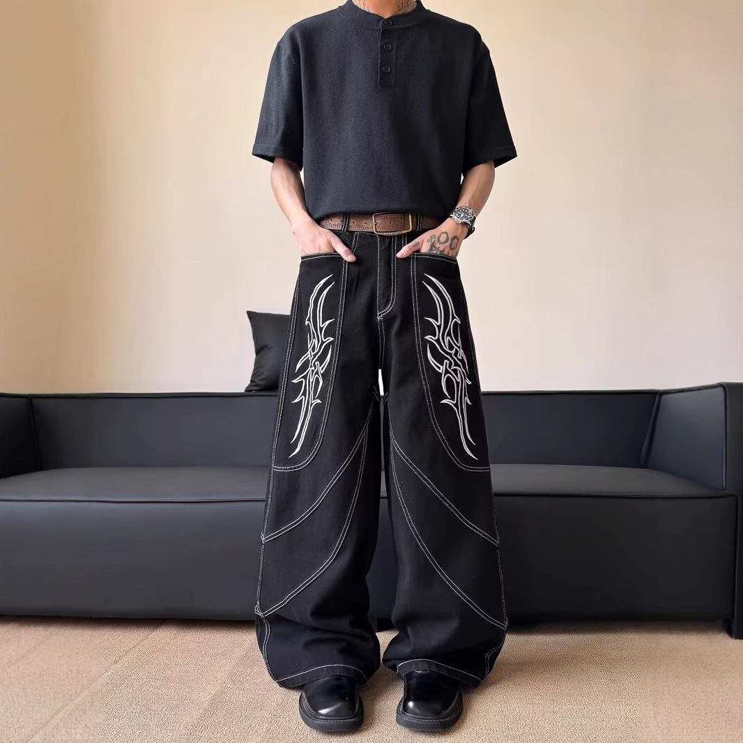外国貿易アメリカンスタイルの新しいレトロなハイストリート刺繍ジーンズメンズ春夏ルーズストレートワイドレッグパンツズボン