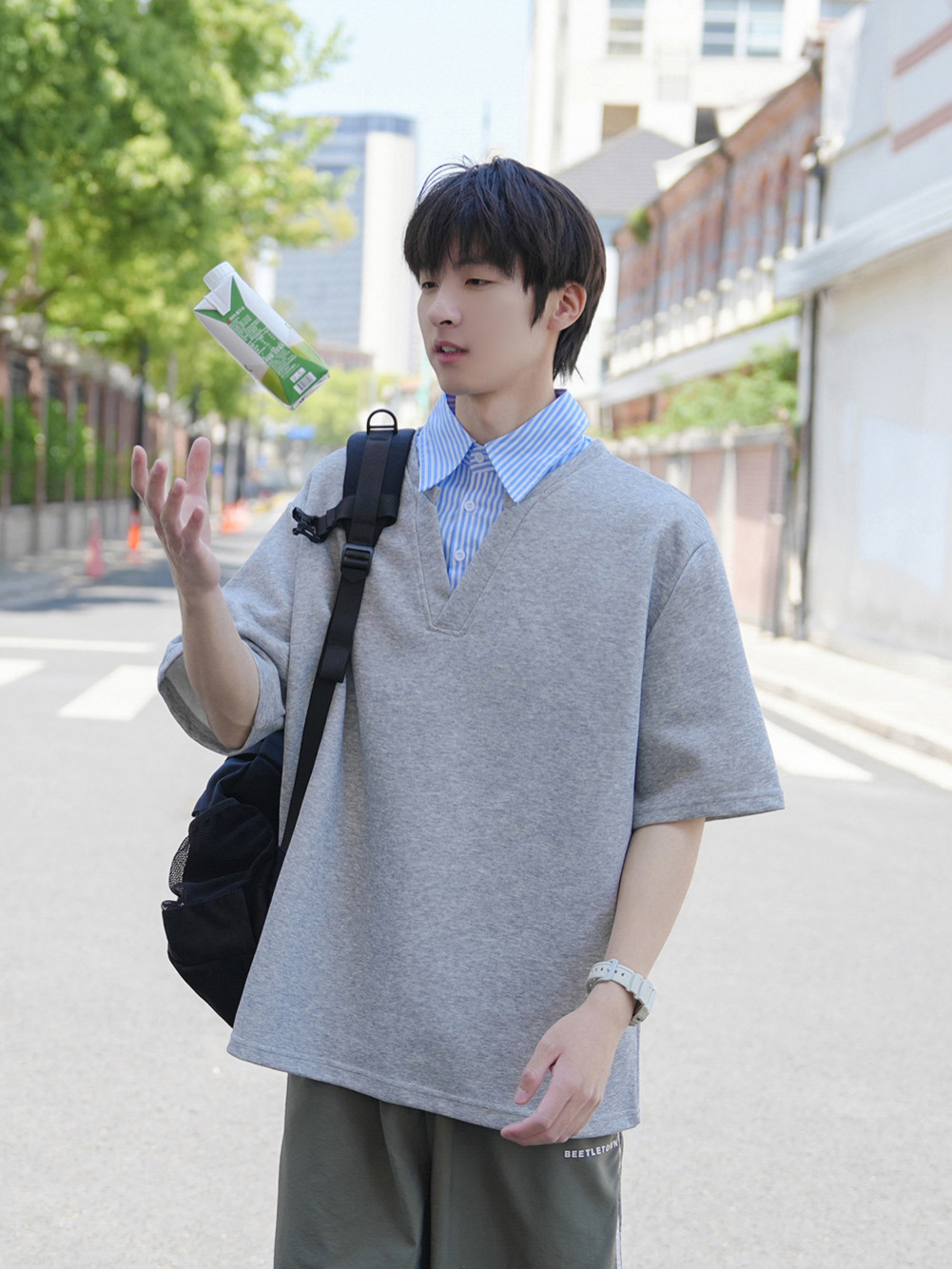 アメリカンニッチヘビーウェイトフェイクツーピース半袖ポロシャツメンズ2025夏ボーイッシュルーズカジュアル半袖トップ