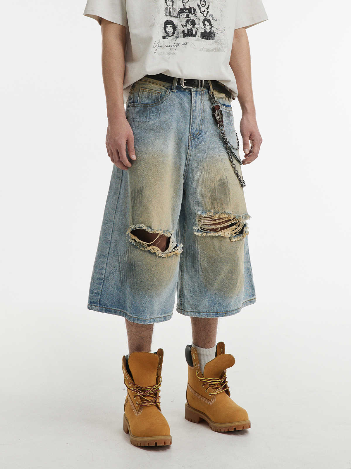 アメリカンレトロな黄色の泥染めのリップドデニムショートパンツ、男性と女性用、新しい夏スタイルのウォッシュドルーズでハンサムなクロップドパンツ