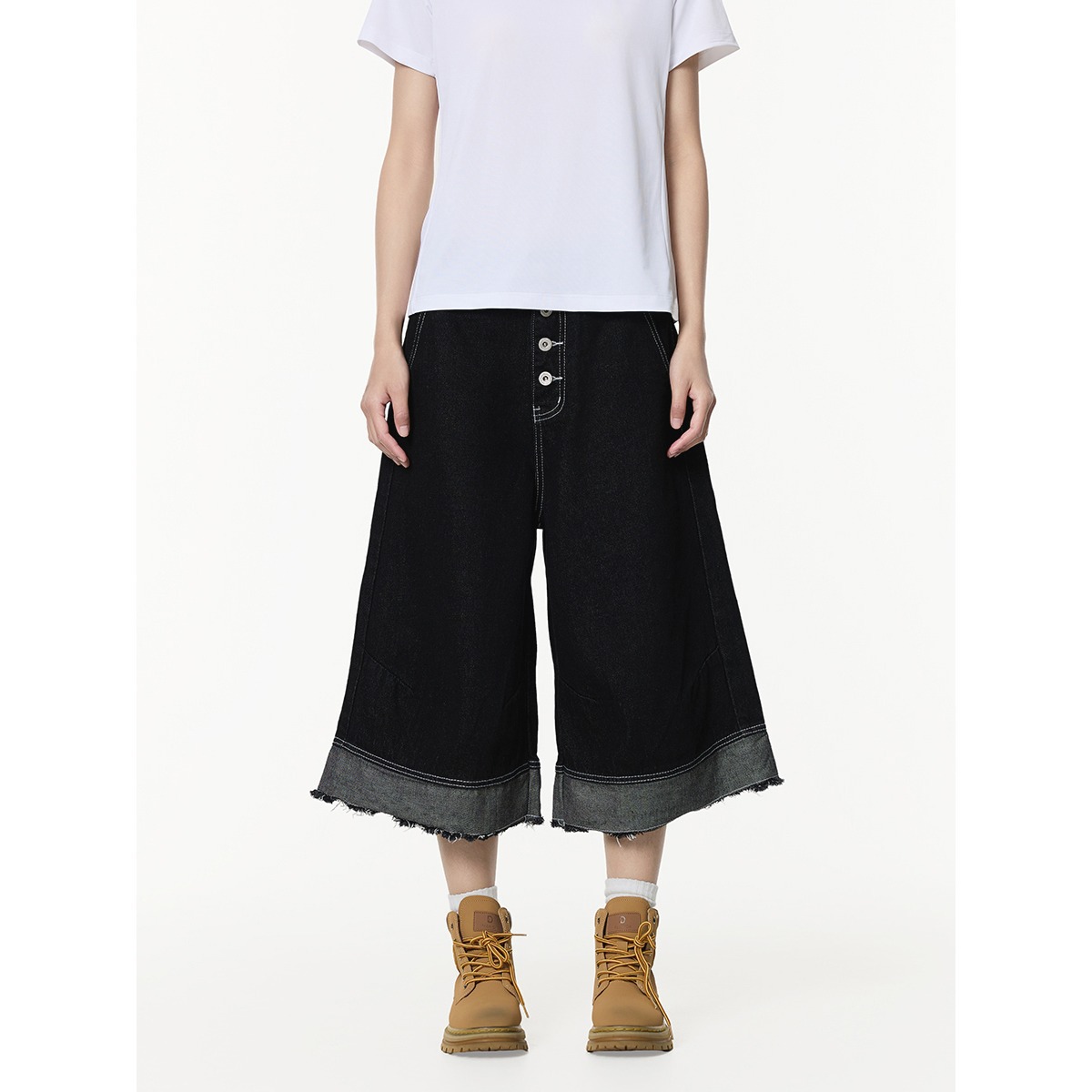 2025 アメリカンレトロブラックトップステッチローエッジデニムクロップドパンツ男性と女性のためのハイエンドルーズワイドレッグショーツトレンディ