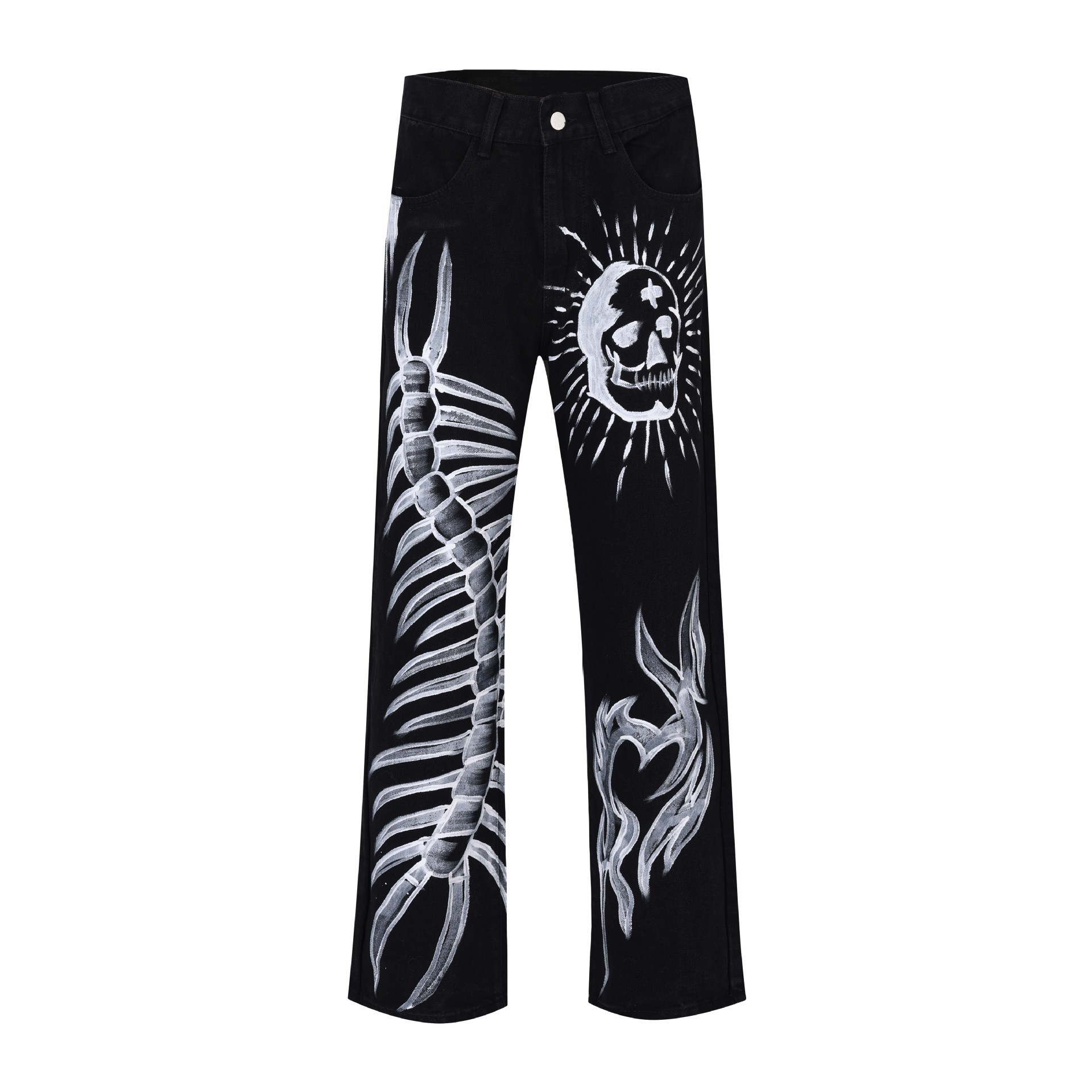 ダークスタイルの大きなムカデのスカルプリントニッチデザインジーンズ、男性と女性用、トレンディなブランドのルーズワイドレッグパンツ