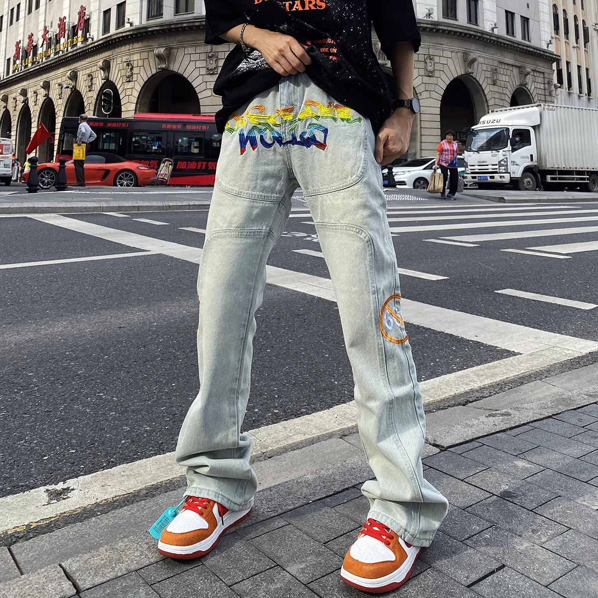 アメリカンハイストリートレインボー刺繍レタードオールドウォッシュマイクロフレアスリムジーンズレトロヒップホップスプライシングパンツ男性用