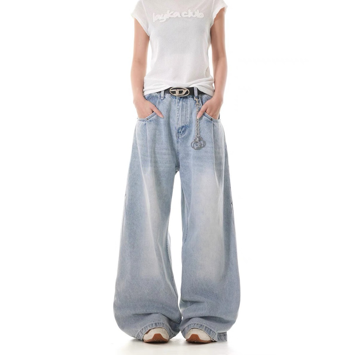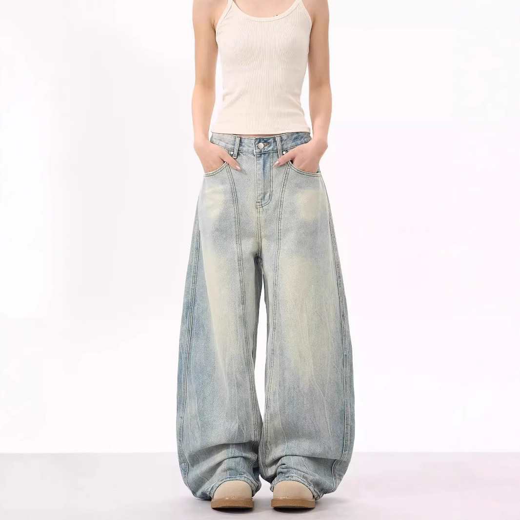 新しい2025トレンディなブランドの男性と女性のためのルーズワイドレッグジーンズ、秋冬ストレートレッグフロアレングスパンツ、アメリカンハイストリートイントレンド