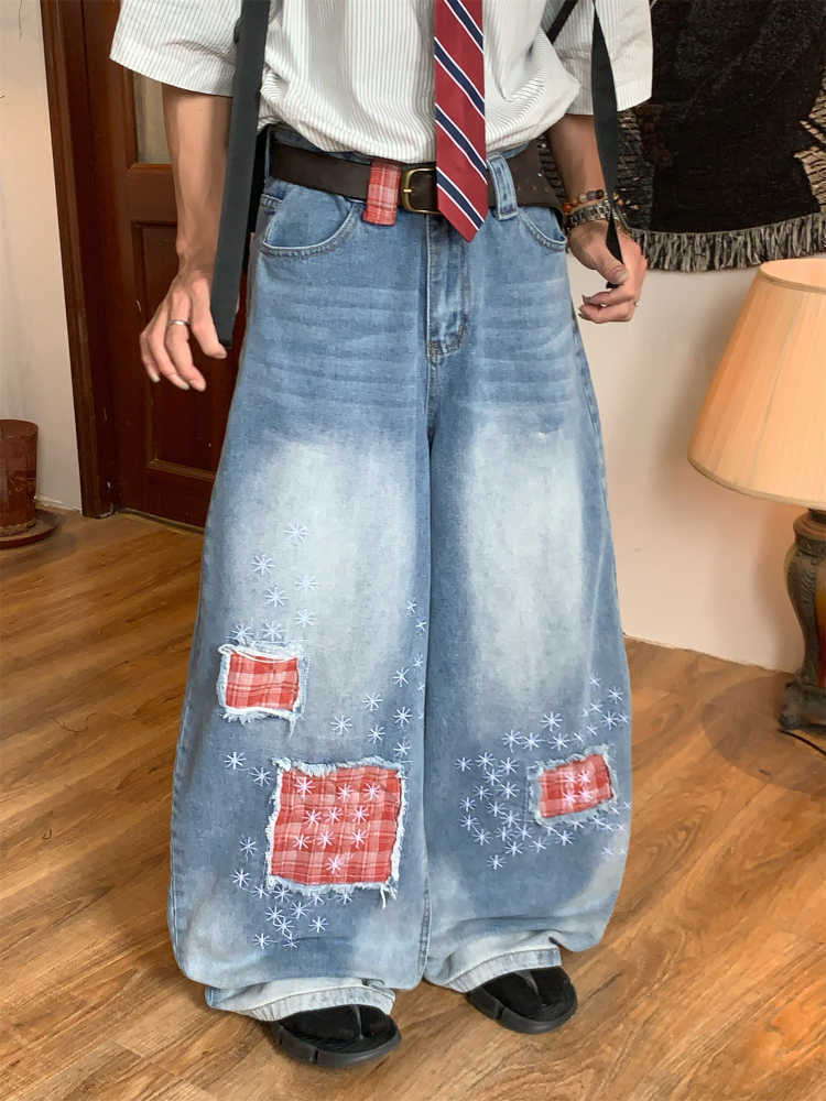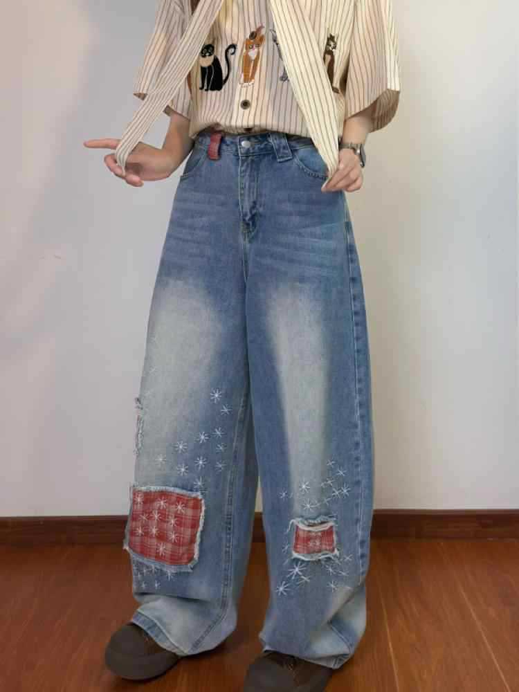 レトロ 2025 春の新スタイルリッピングチェック柄スプライシングジーンズルーズカジュアルフロアレングスワイドレッグパンツトレンディ