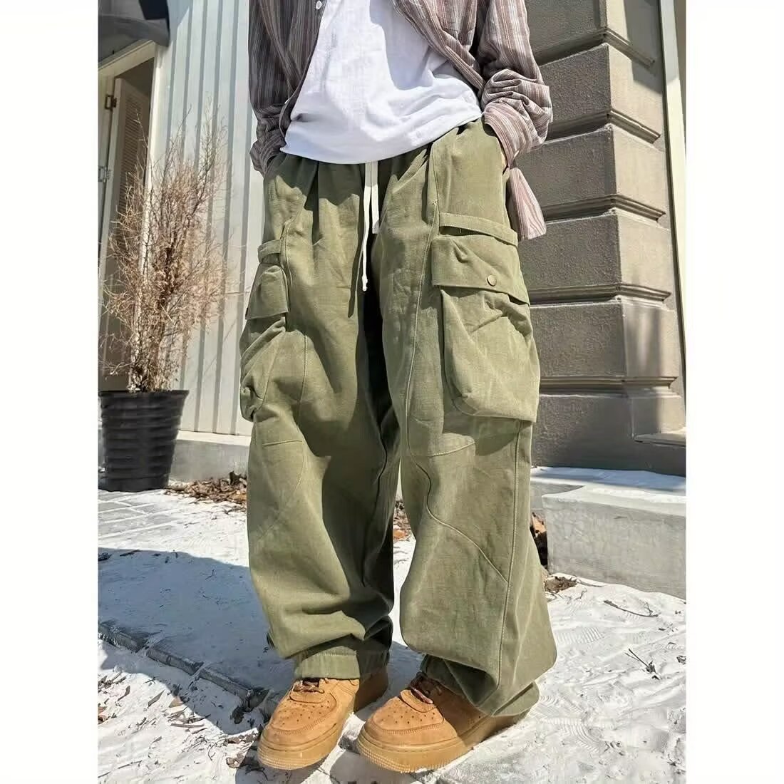 外国貿易日本のレトロなマルチカラー無地大きなポケットデザインヴィンテージドレープテーパードシルエットルーズオーバーオール男性用