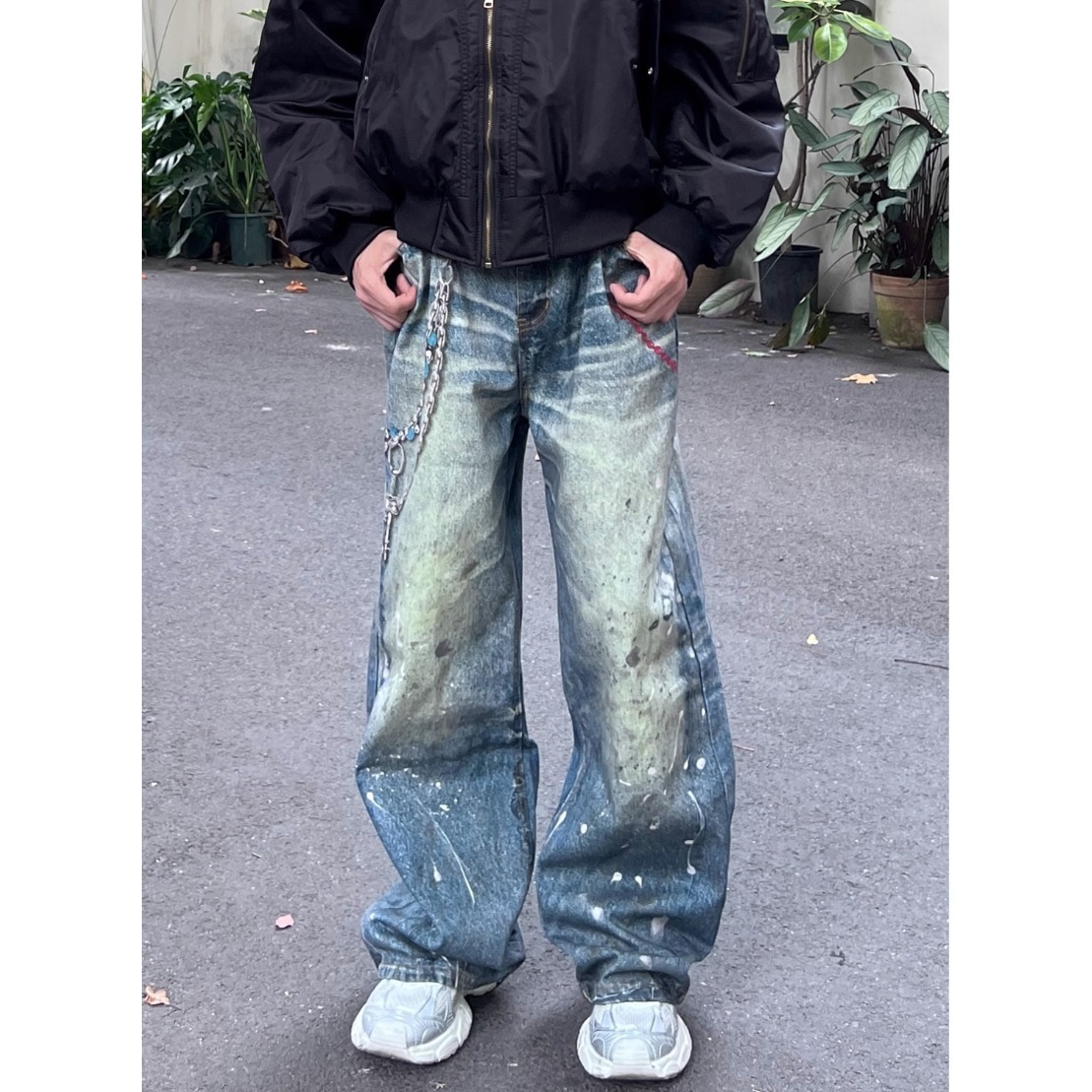 新しいアメリカンレトロなデコンストラクトデザインのウォッシュドグラデーションスナイパージーンズ、男性と女性用、トレンディなルーズワイドレッグパンツ