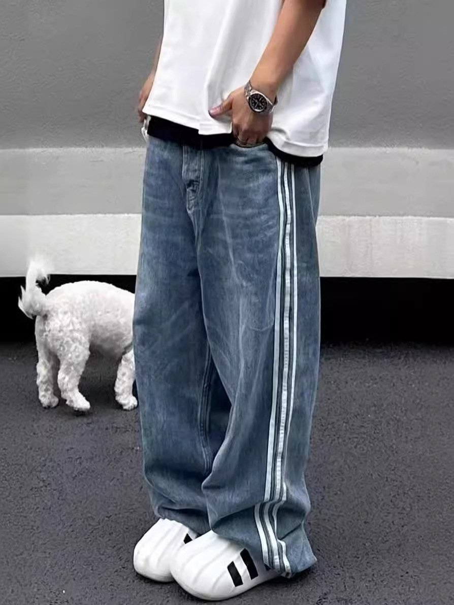 アメリカンレトロストリートスリーストライプジーンズメンズ夏ルーズカジュアル多用途ストレートワイドレッグフロアレングスパンツ