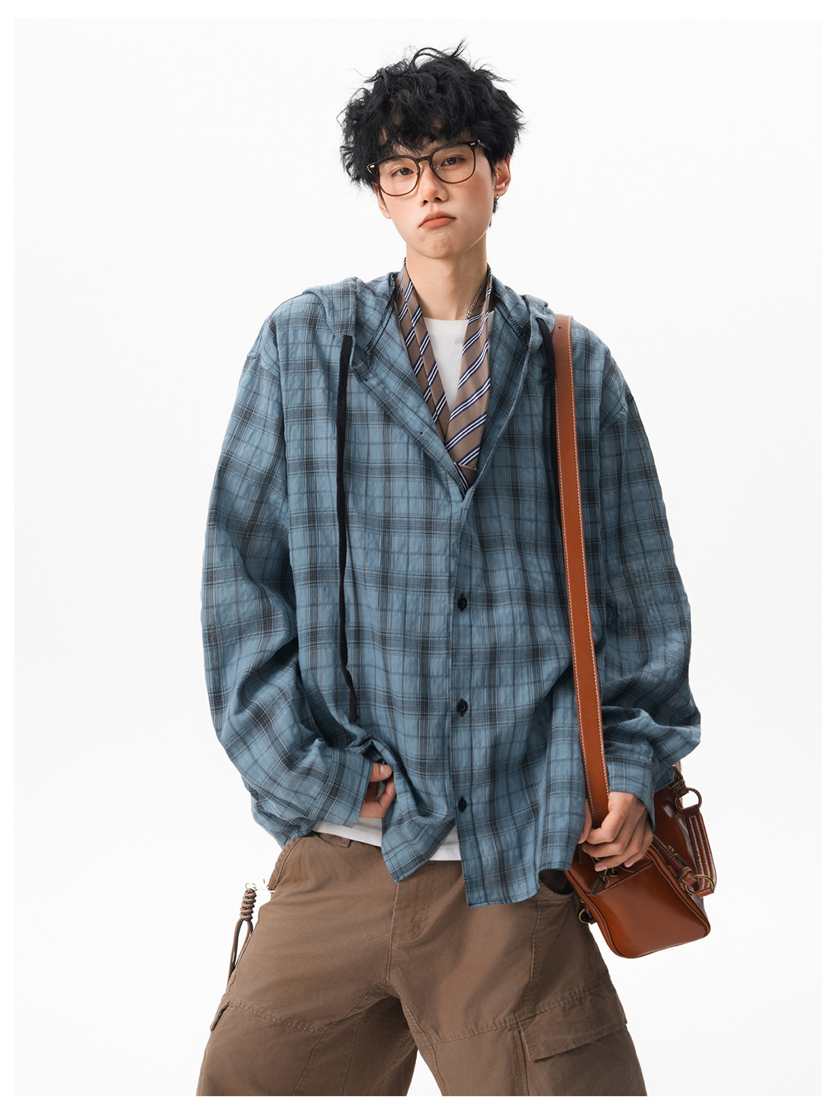 フード付きチェック柄日焼け止め長袖シャツ男性と女性のための 2025 夏薄い怠惰なシャツカジュアルカップルジャケット