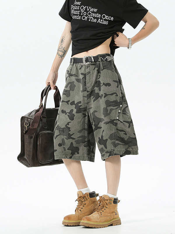 アメリカンハイストリート迷彩リベットパッチワークショーツヒップホップハンサムストリートパンツトレンディブランドメンズミッドパンツ