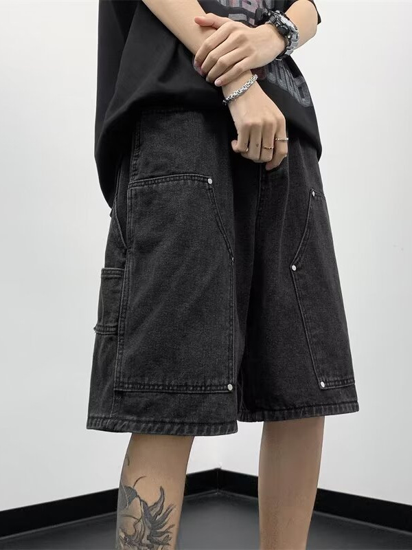 ワークウェアデニムショートパンツメンズ夏薄手トレンディブランドルーズストレート5点パンツアメリカンレトロウォッシュカジュアルパンツ