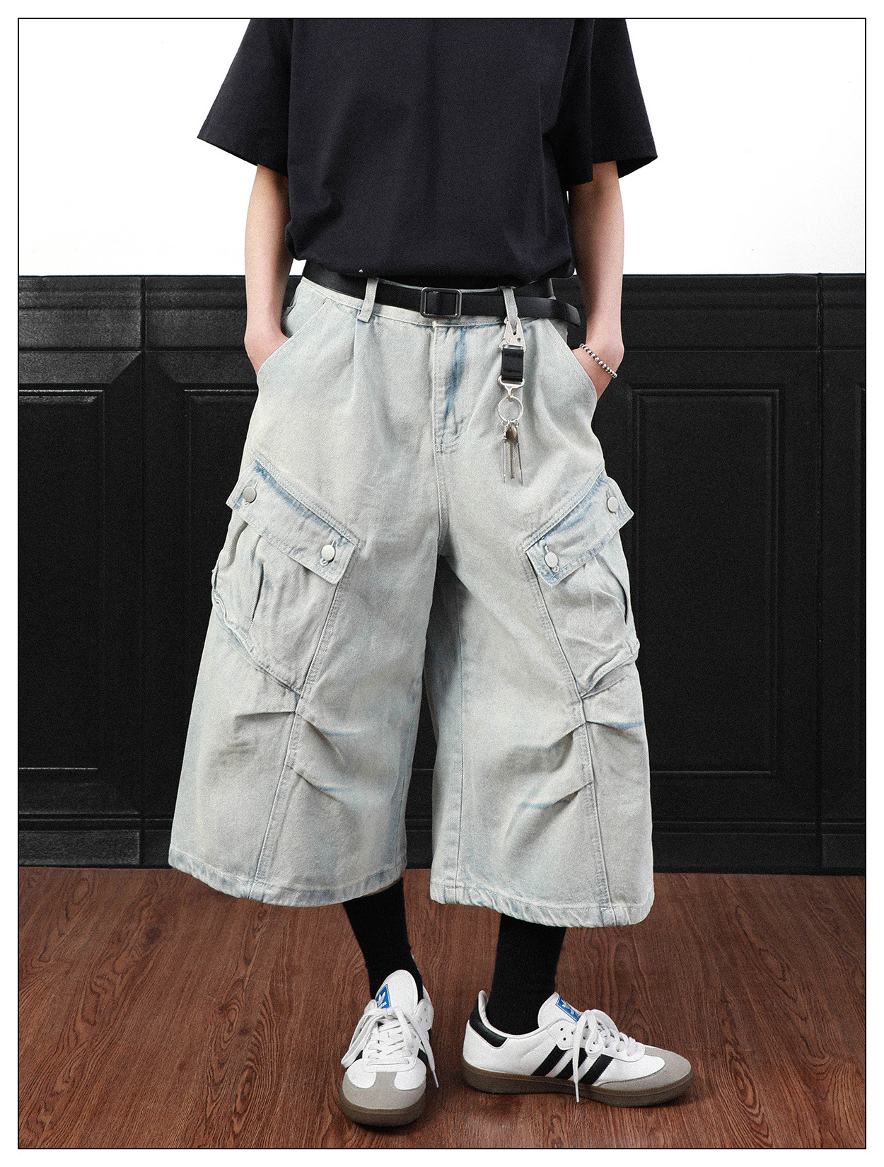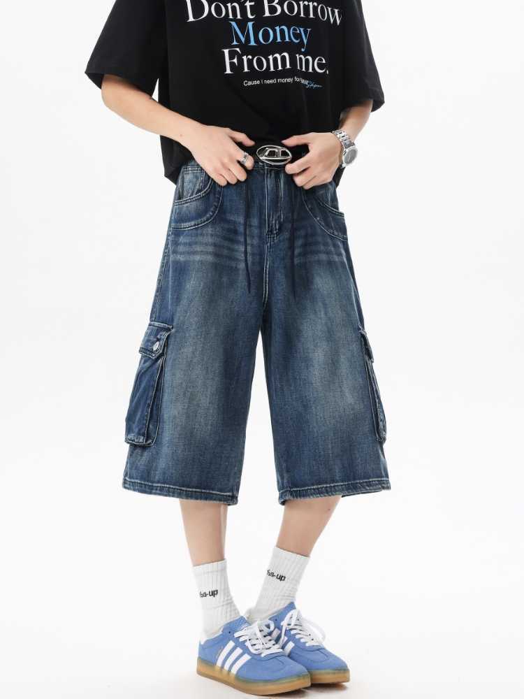 アメリカンデニムカーゴショーツメンズ2025新作夏ルーズワイドレッグマルチポケットストレートカジュアル5点パンツ