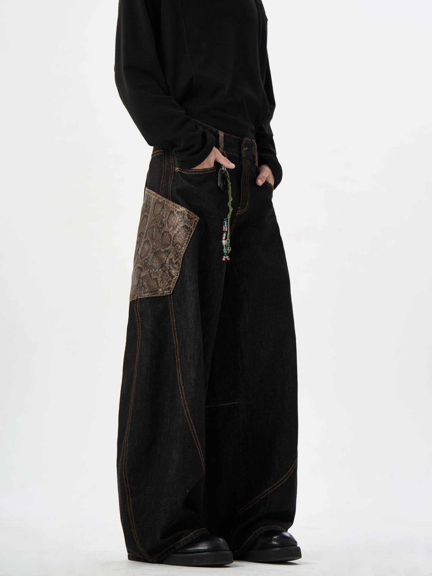 2025 春と秋の蛇年限定ニッチステッチシミターパイソンブラックジーンズ多用途カジュアルワイドレッグパンツ男性と女性用