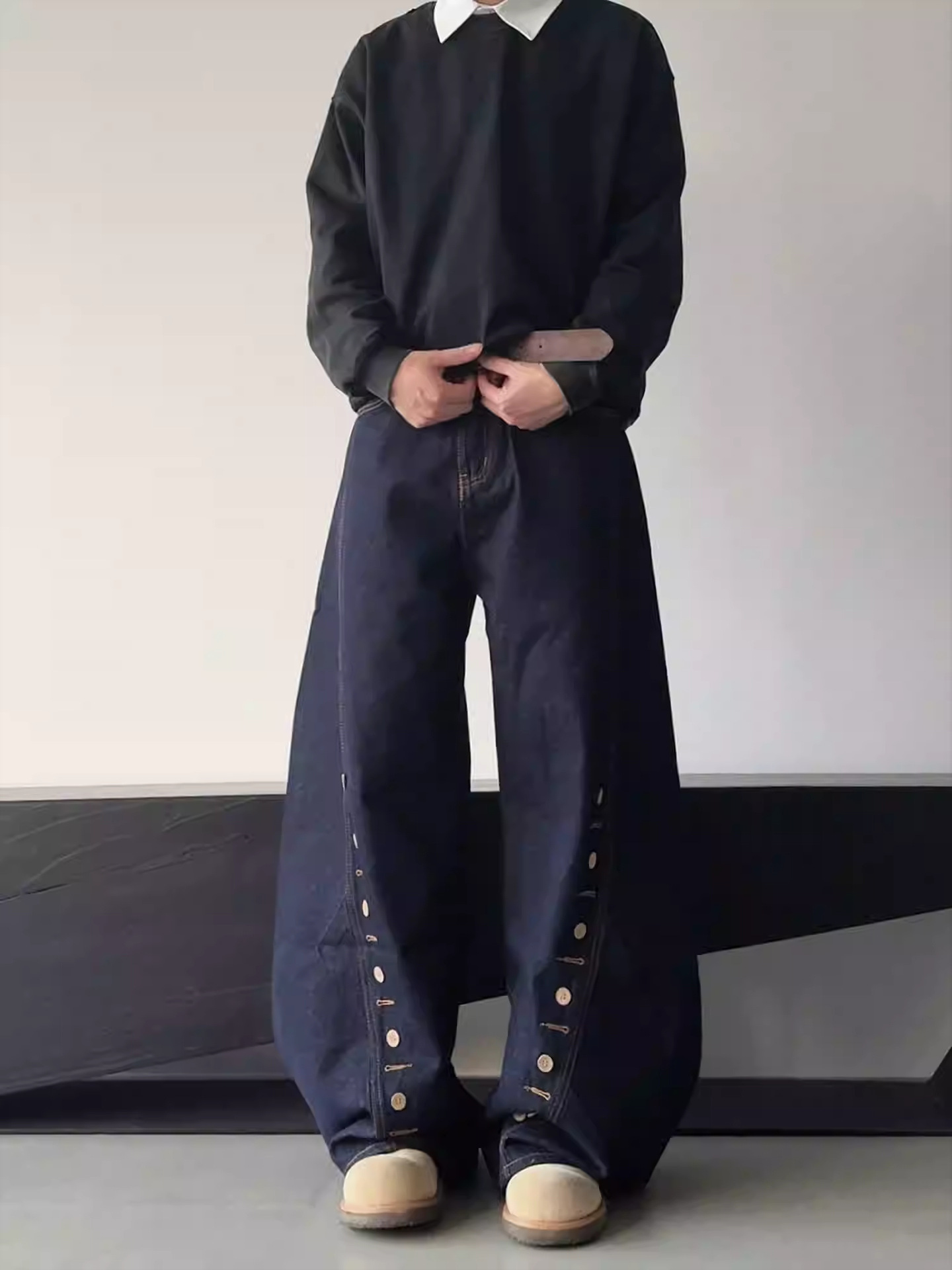ボタンブルー シミターアメリカン レトロ ダメージ加工 クリーンフィット ハイエンドデザイン ワイドレッグ ルーズジーンズ メンズ