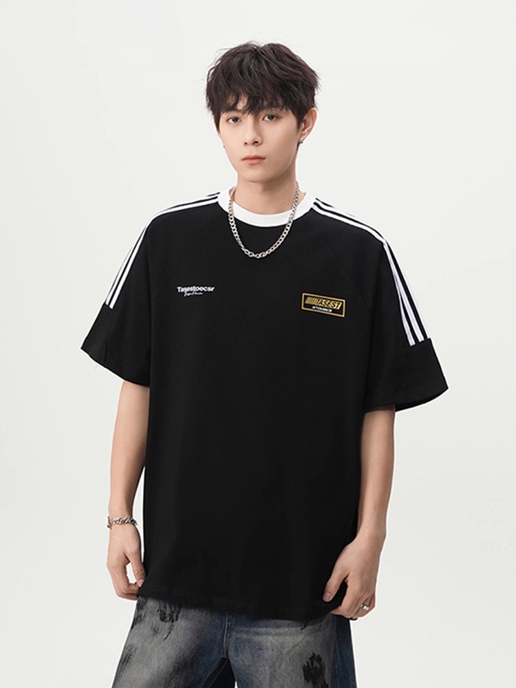 アメリカンレトロな3ストライプス半袖Tシャツ、夏のトレンディな厚手のコットンの男性と女性用、ゆったりとした多用途のカップル用半袖トップス