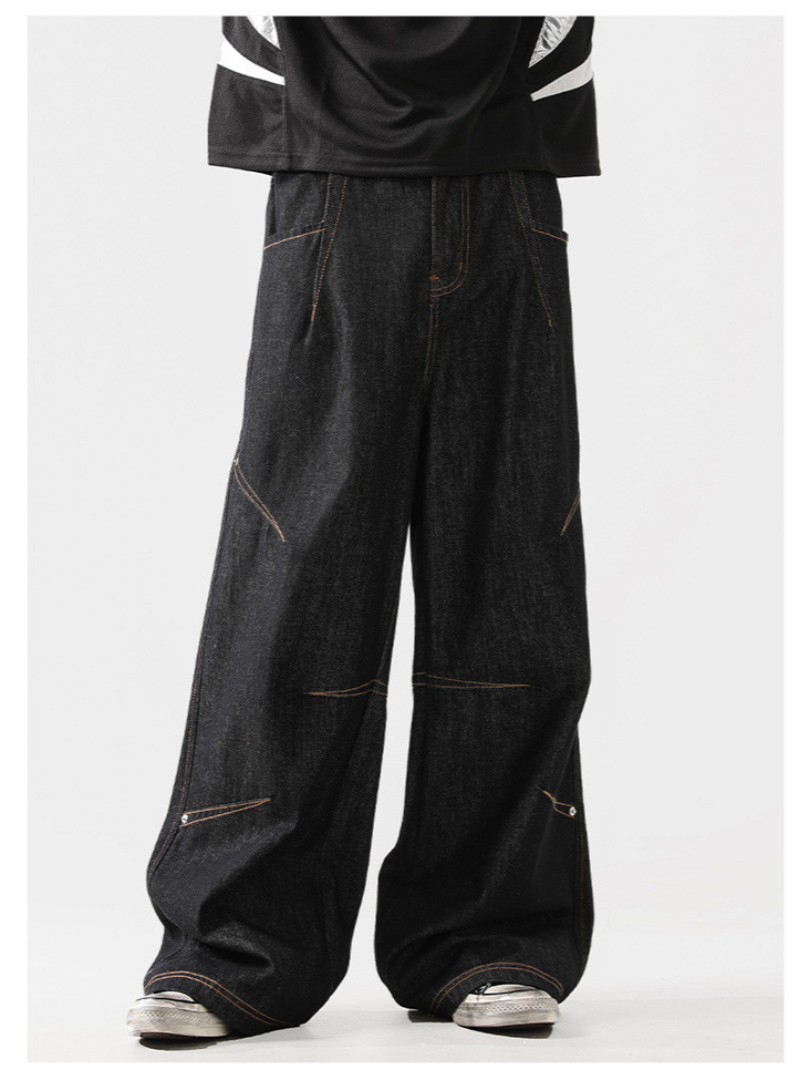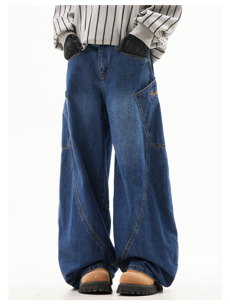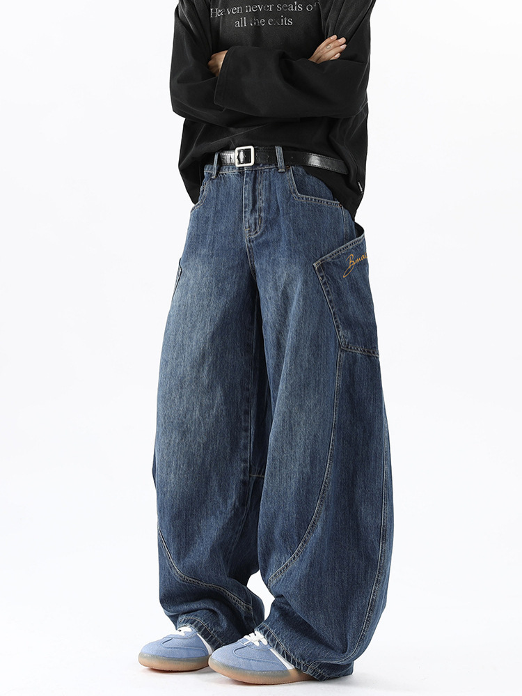 アメリカンレトロな大きなポケットの男性と女性のためのスナイパー ジーンズ、春と秋のハイストリート デザイン、ゆったりとしたワイドレッグ フロアレングス パンツ