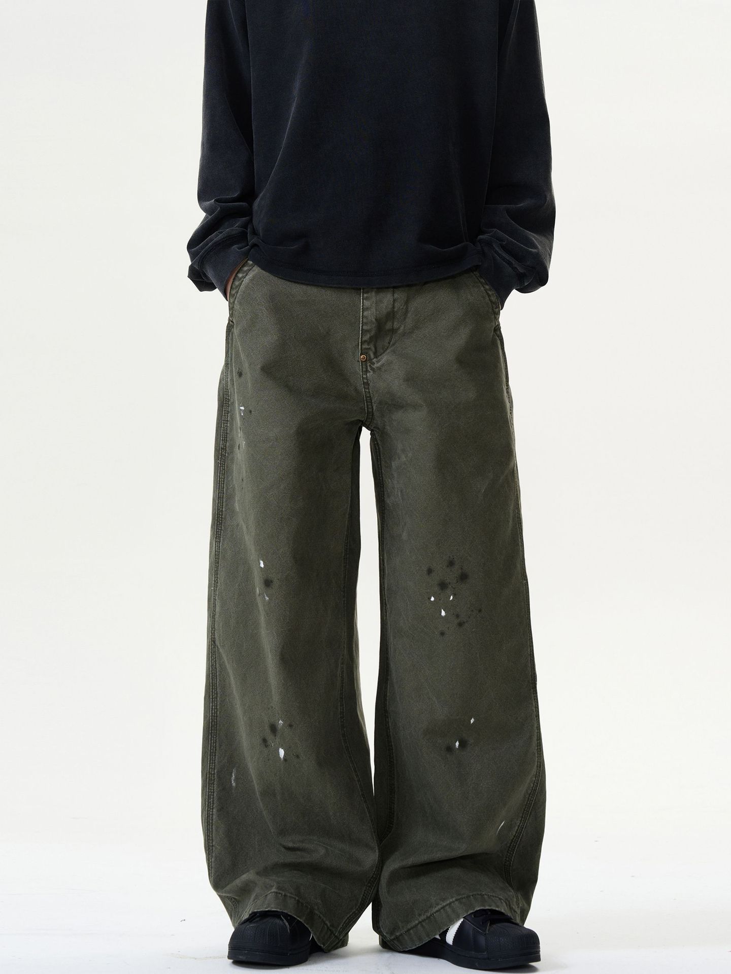 アメリカンレトロスプラッシュインクワークジーンズメンズヴィンテージウォッシュ加工ストレートカジュアルルーズワイドレッグパンツ
