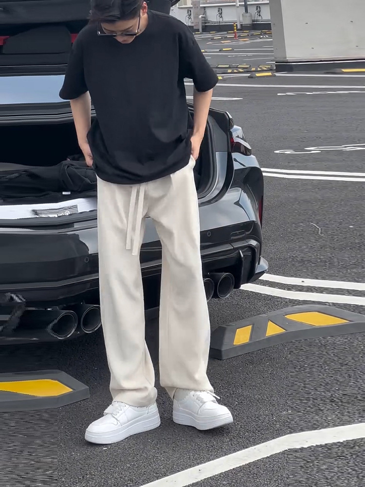 夏用の男性用オフホワイトのドレープパンツ、ハンサムで高級なアイスシルクパンツ、スリムで背の高い人向けのカジュアルパンツ