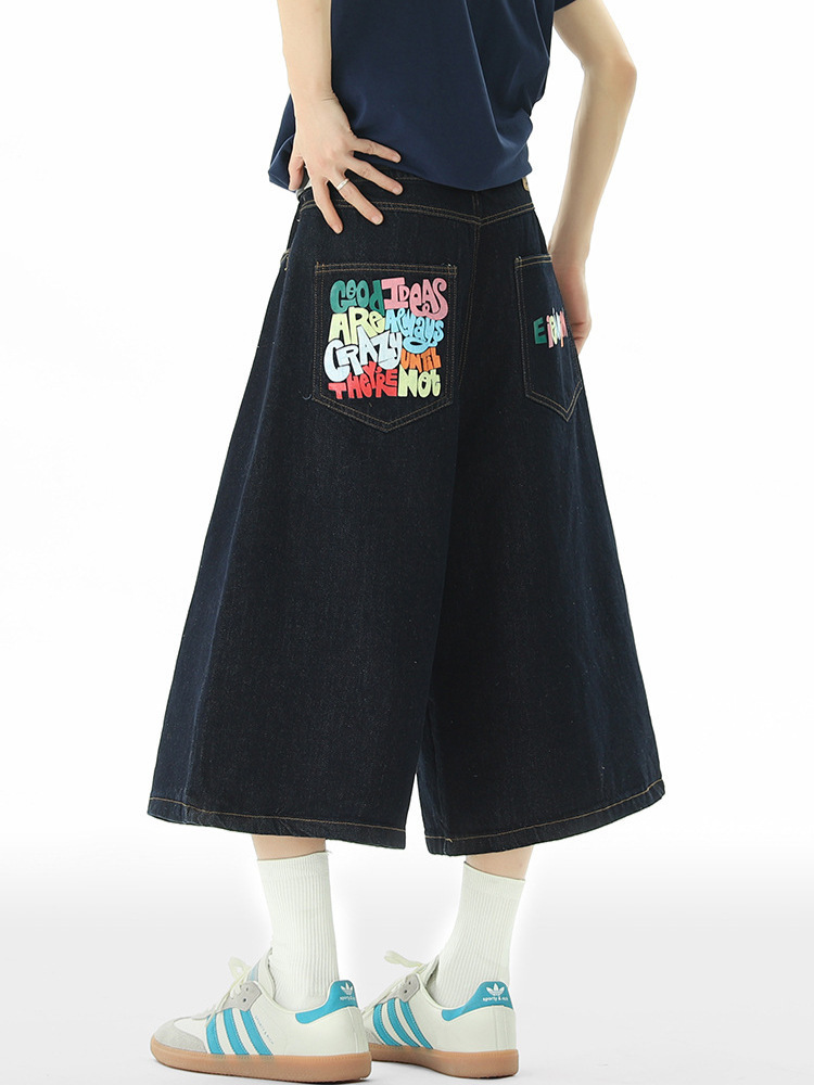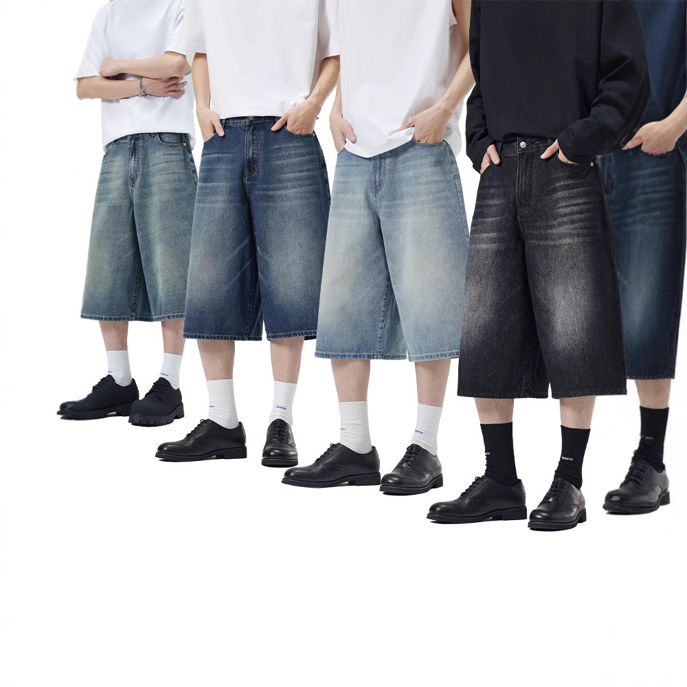 アメリカンワークウェアデニムショートパンツメンズ2025夏新作ユースルーズカジュアルストレートワイドレッグクロップドパンツ