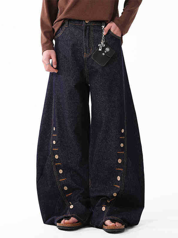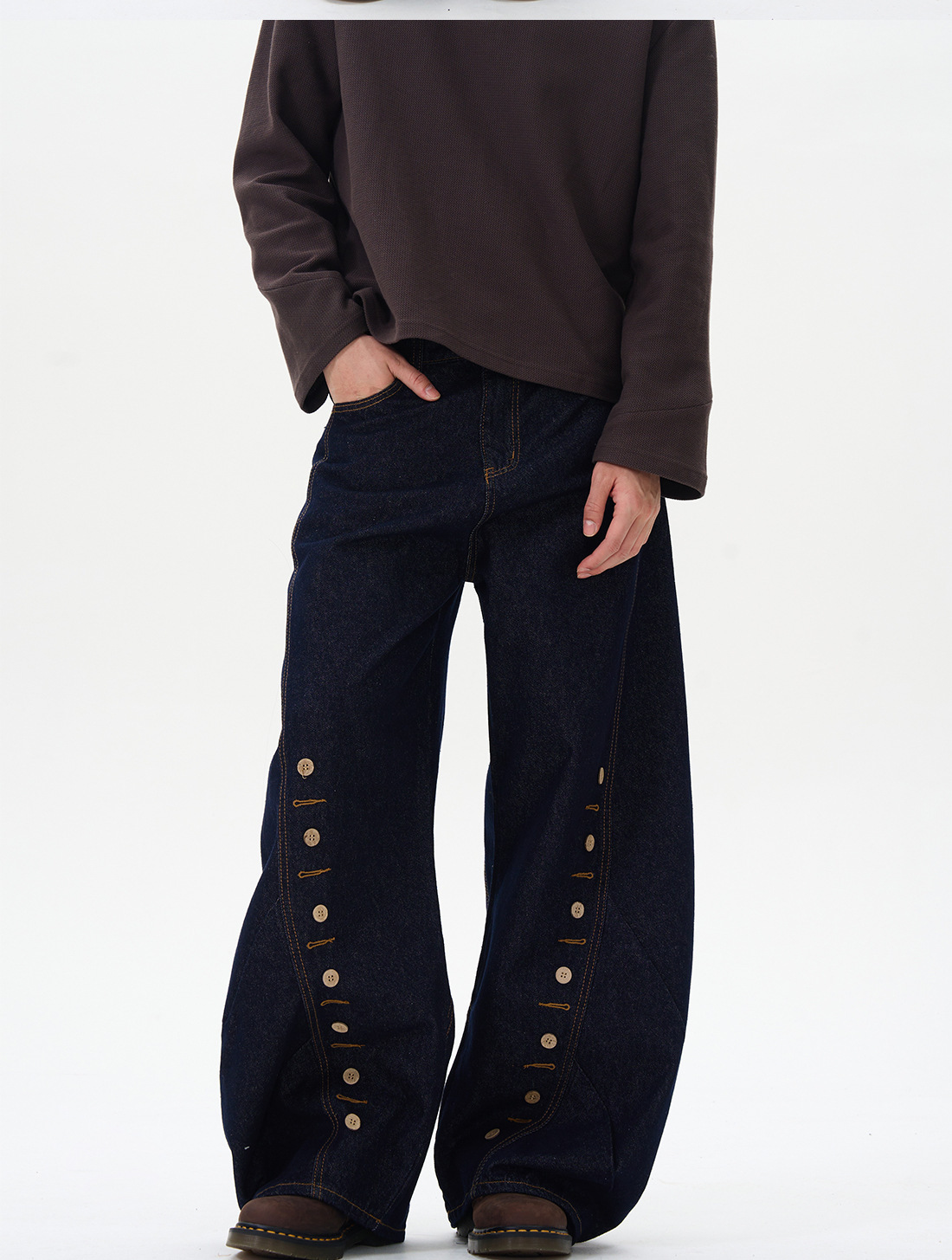 ニッチボタンデザインジーンズメンズ春秋アメリカンレトロルーズカジュアルデコンストラクトハンサムワイドレッグスモールソードパンツ