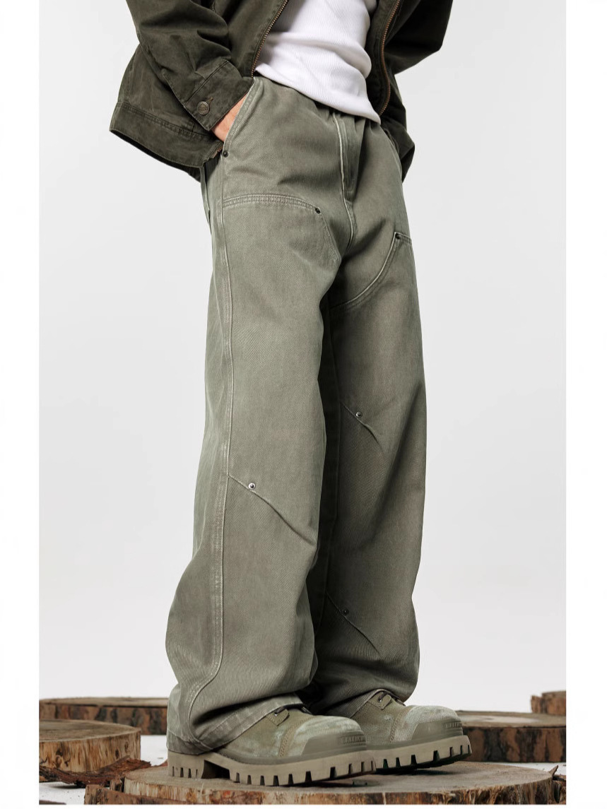 男性用あんこグリーンジーンズ、レトロなダメージ加工ウォッシュストレートレッグニッチルーズデザイン、男性用多用途カジュアルパンツ