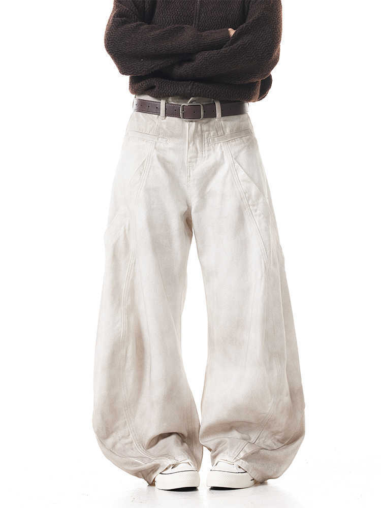 アメリカンレトロなウォッシュ加工のダーティーホワイトシミタージーンズ、男性と女性用、ルーズストレートワイドレッグカジュアルフロアレングスパンツ、トレンディ