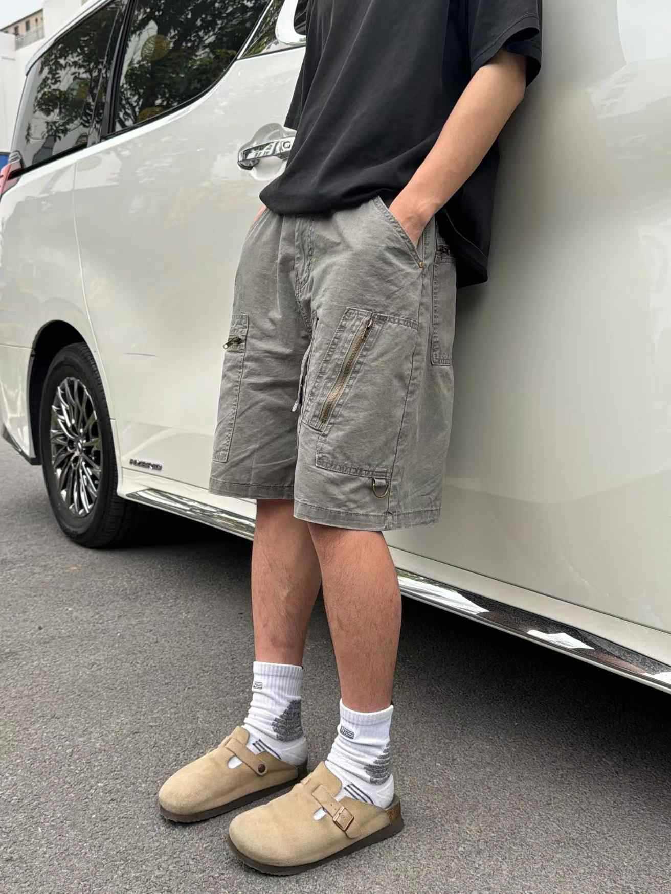 新しいアメリカンレトロヘビーウェイトマルチポケット調節可能なベルトデザインの男性と女性のカジュアルルーズウォッシュド5点パンツ夏