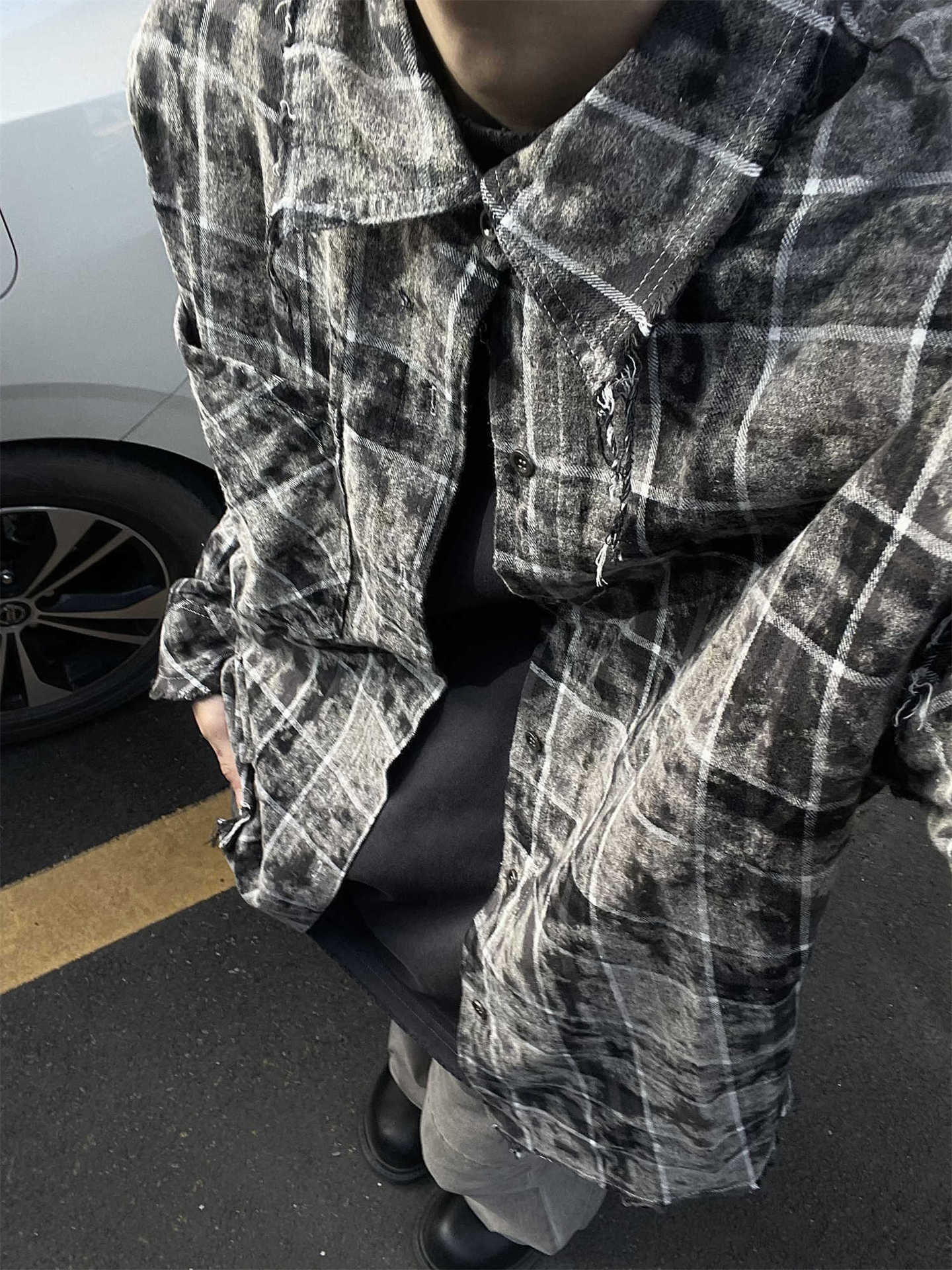アメリカンレトロヒップホップタイダイチェック柄ダメージローエッジシャツシャツ男性と女性のためのルーズ春と秋の多用途ジャケット男性用