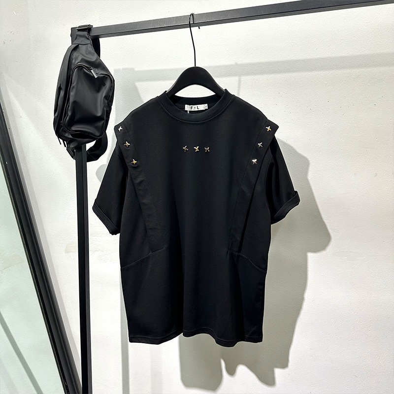 夏のトレンドブランド、おしゃれなワークウェア、ニッチなフェイクツーピースリベット半袖Tシャツ、人気のハンサムで高級感のあるトップス