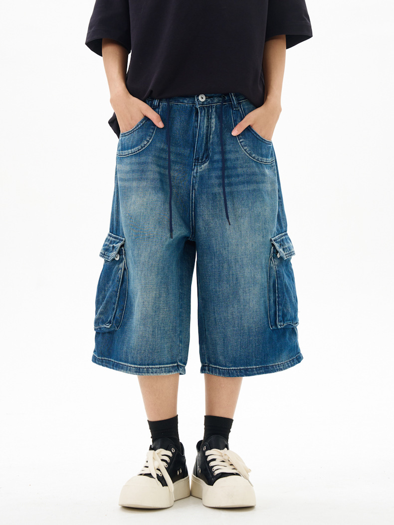 2025 夏薄いアメリカンウォッシュカジュアルルーズマルチポケットデニムクロップドパンツ男性と女性のストリートショーツトレンディ