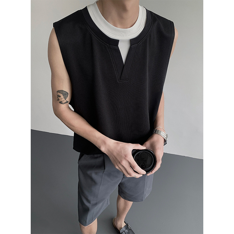 スプライスVネックフェイクツーピースベストメンズ夏薄手スポーツルーズ速乾ノースリーブTシャツトップ