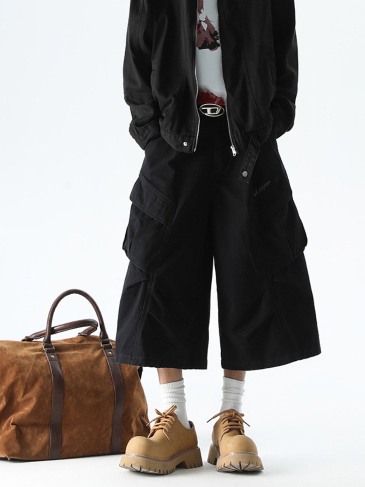 マルチポケットワークウェアクロップドパンツメンズ2025夏新作アメリカンワイドレッグルーズストレートカジュアルショートパンツトレンディ