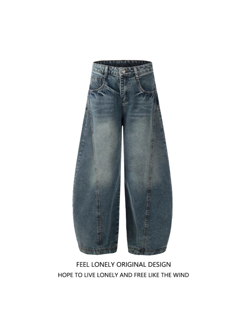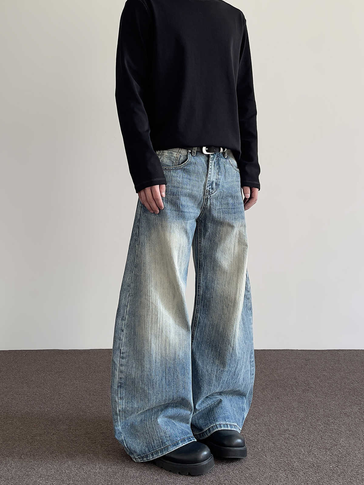 アメリカンレトロなウォッシュ加工のシルエットのワイドレッグジーンズ、男性と女性用、トレンディなルーズなデコンストラクトのフロアレングスのドレープデザインのスモールブレードパンツ