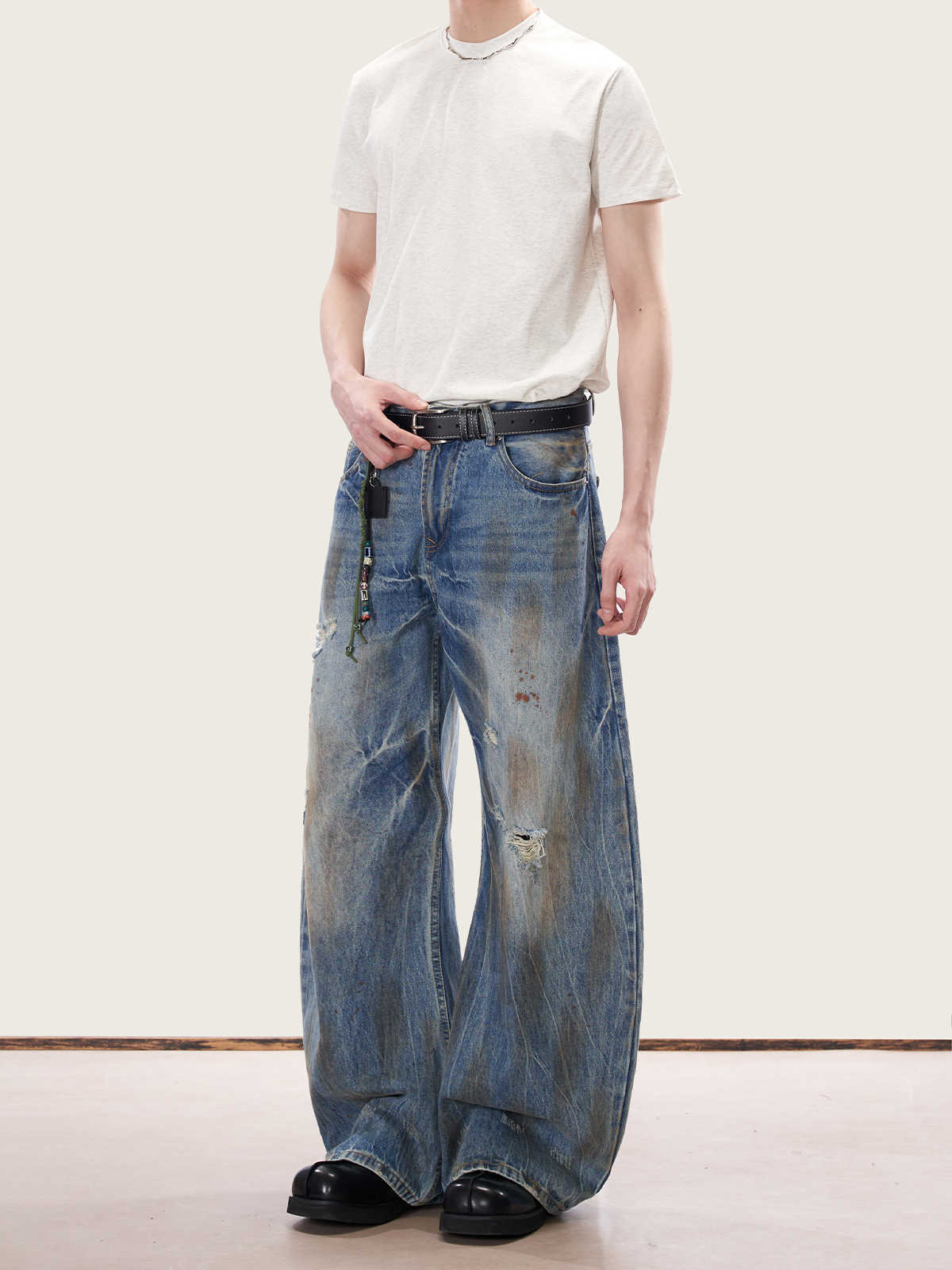 アメリカンレトロなダメージ加工ライトニングジーンズメンズ2025新作ルーズストレートパンツハンサムヒップホップシミターパンツ