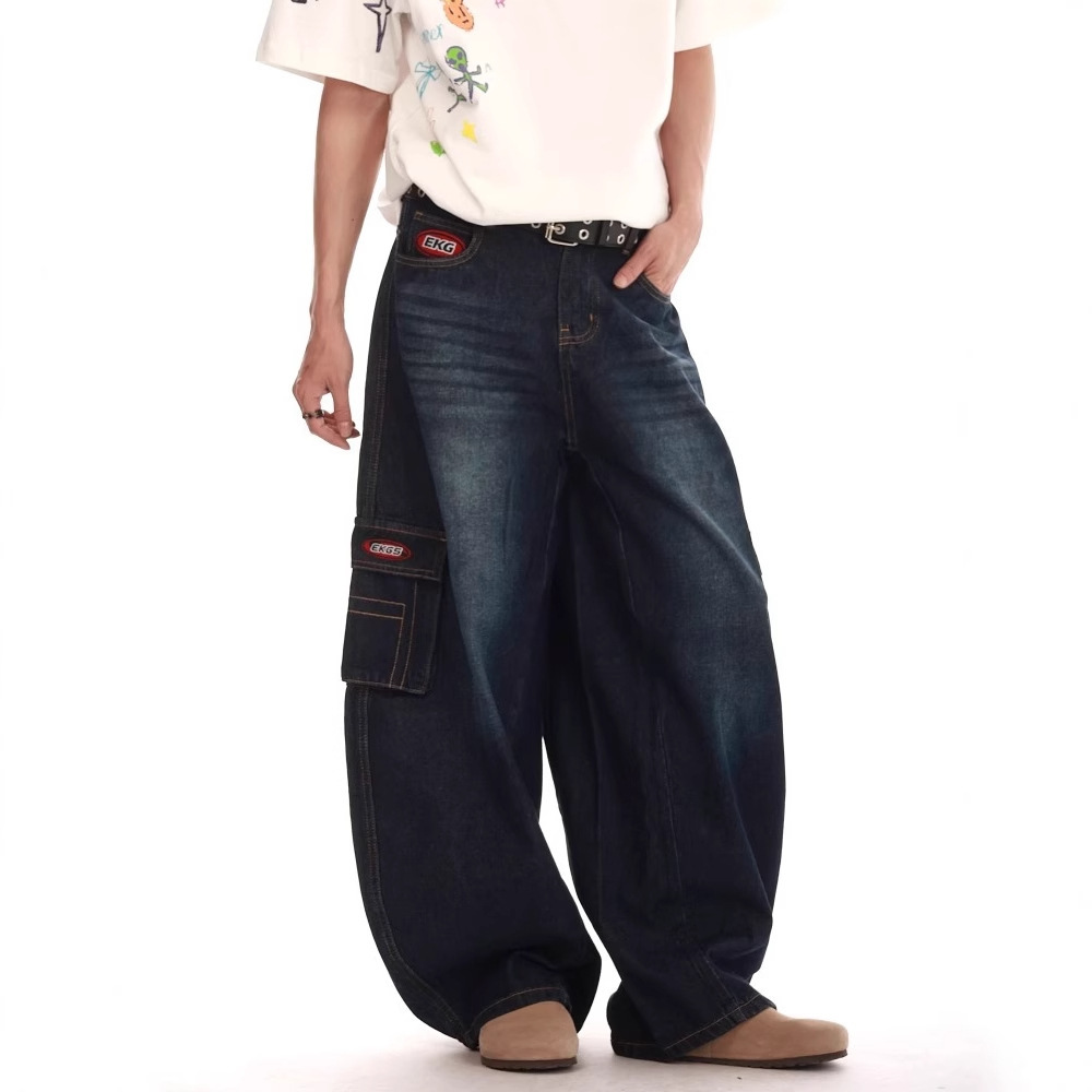 ハイストリートレトロマルチポケット猫ひげデザインワイドレッグジーンズ夏メンズアメリカン刺繍デザインロングパンツ