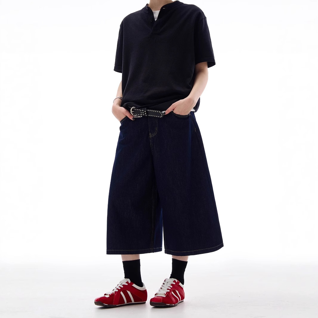 2024 新しいアメリカンレトロウォッシュ加工デニムショートパンツ男性と女性のためのルーズストレートワイドレッグ多用途クロップドパンツ