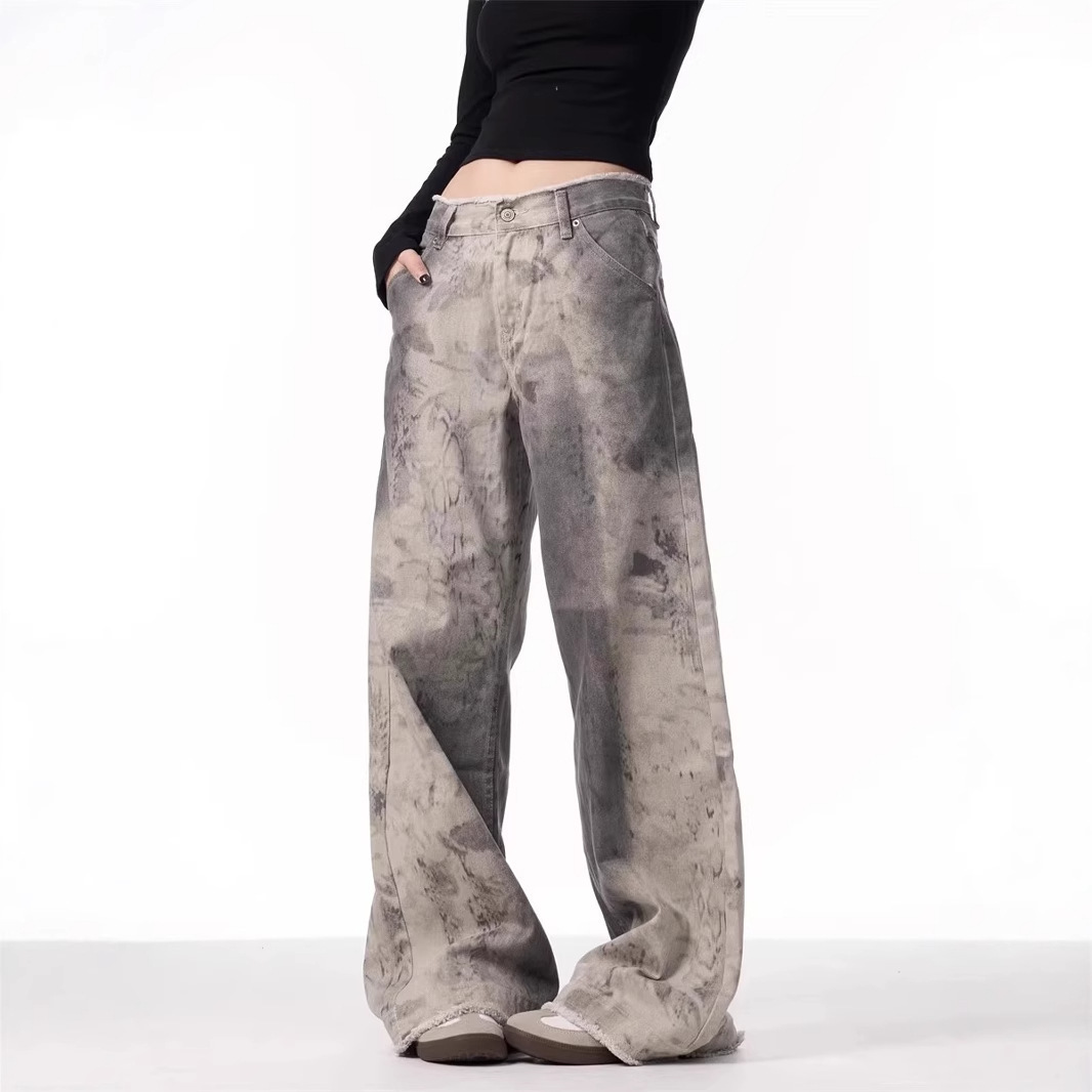 アメリカンハイストリートインクスプラッシュウォッシュスネークパターンジーンズ男性と女性用、ニッチルーズワイドレッグパンツ、ストレートレッグフロアレングスパンツ