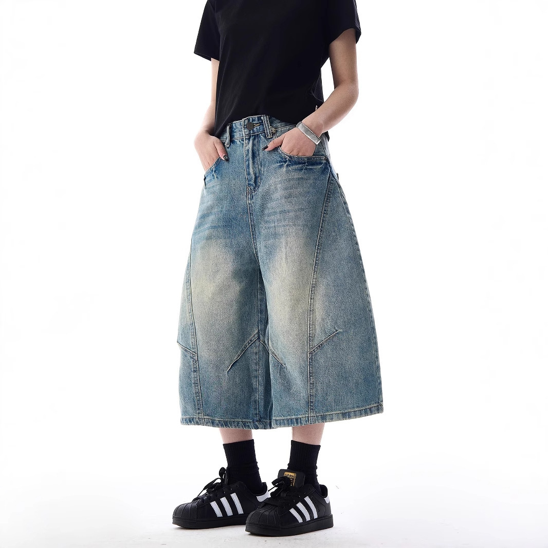 夏アメリカンレトロウォッシュデコンストラクトシミターデニムショートパンツ男性と女性のための新しいトレンディなブランドルーズワイドレッグクロップドパンツトレンディ