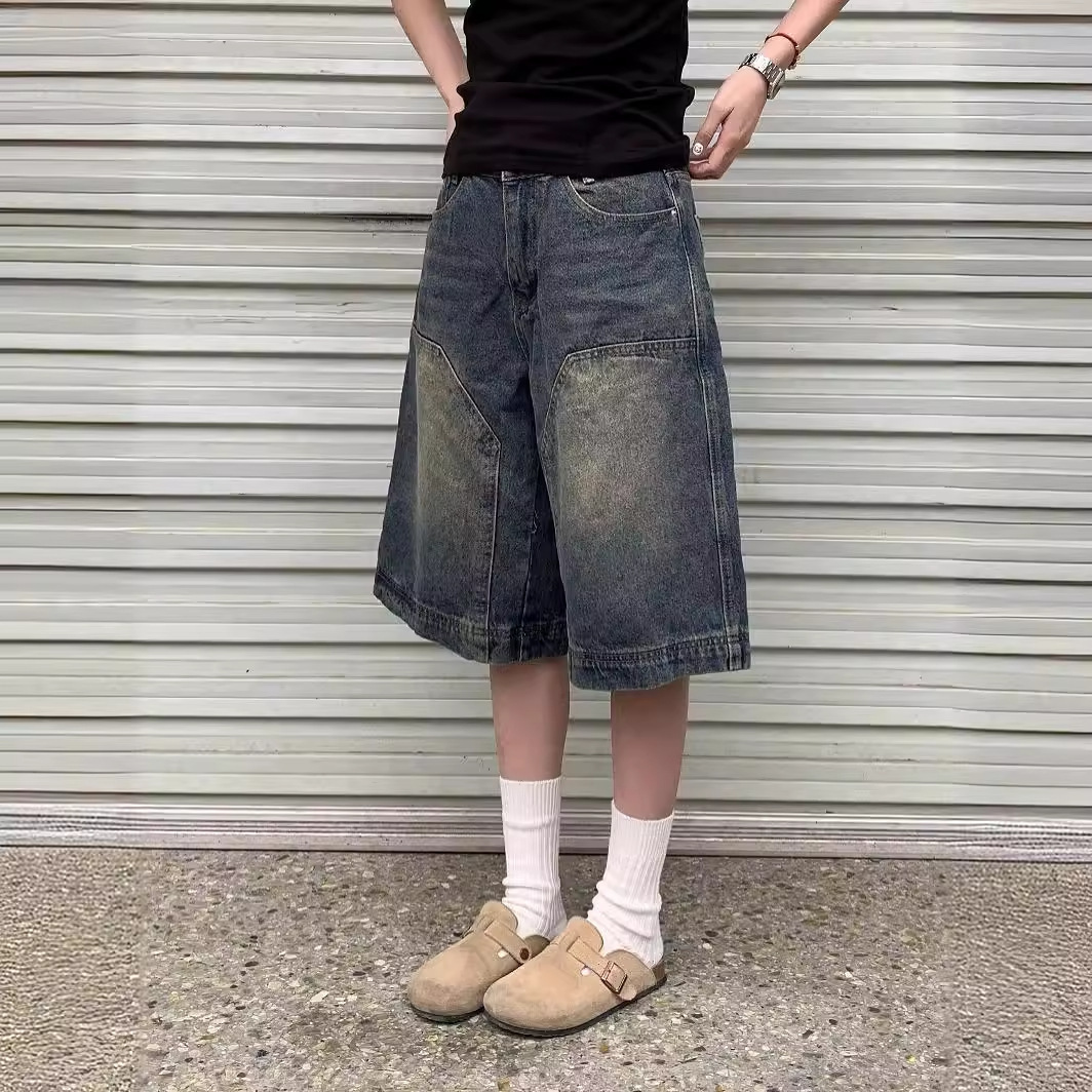 アメリカンストリートレトロ構造ウォッシュクラックシミターセブンポイントジーンズメンズ夏の新しいルーズワイドレッグショーツ