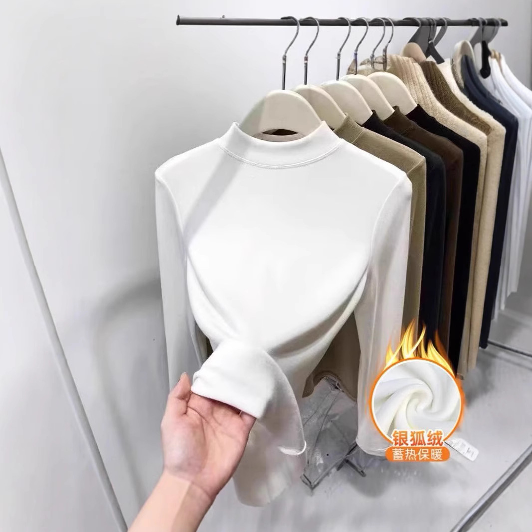 2024冬の徳絨合銀狐絨合はやせている半高襟の底のシャツの女性の保温の中で一体の絨毛の長袖を掛けます。